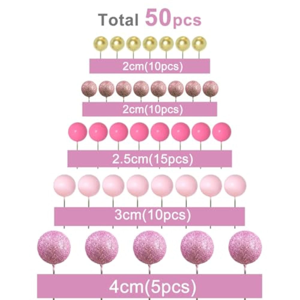 | Package Includes: 50 Pcs Cake Balls Decorations With Different Colors And Sizes. They Are Glitter Pink?Pink?Hot Pink?Glitter Rose Gold And Gold Colors As Shown In The Picture. | | Size: These Ball Cake Toppers, There Are 20 Balls With A Diameter Of 0.79 Inch/ 2 Cm, 15 Balls With A Diameter Of 0.98 Inch/ 2.5 Cm, 10 Balls With A Diameter Of 1.18 Inches/ 3 Cm, 5 Balls With A Diameter Of 1.57 Inches/ 4 Cm. The Combination Of Size And Color Will Decorate Your Cake More Layered And Delicate. | | Premium Material: These Colorful Balls Cupcake Toppers Are Made Of Foam And Wire. Safe To Decorate Food At Room Temperature, Such As Cake Or Dessert Decorating Use, Or Cupcakes, Fruits, Cheese And Any Appetizer You Want To Decorate. | | Party Cake Decorations: These Cake Decoration Balls Are Very Cute, Like Mini Balloons, Several Colors Have Been Matched And Combined, Very Suitable For Any Party Cake Decoration, Such As Birthday Party, Baby Shower, Garden Party, Home Party, Valentines, Wedding, Gender Reveal Party, Anniversary Party Cupcake Decorations. You Can Also Apply Them For Ice Cream, Fruits, Cookies And Other Desserts. | | Notice: These Colorful Balls Cake Decoration Are Disposable And Not Edible?Only For Decoration Purposes, And Please Do Not Use It In Oven Or Microwave?Some Glitter Will Fall Off The Surface Of The Ball. Please Knock Off The Excess Glitter Before Use. | |