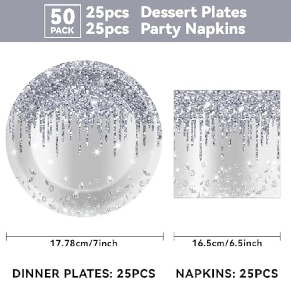 | Package Includes: This Silver Dessert Tableware Set Contains 25 Pcs 7Inch Glitter Diamonds Silver Themed Plates And 25 Pcs 6.5Inch Diamonds Silver Themed Napkins, Ample Quantity To Satisfy Party Needs. | | Premium Material: Our Silver Glitter Plates And Napkins Are Made Of Quality Paper, No Smell And Well-Printed, Glitter Diamonds Plates Are Sturdy While Silver Napkins Are Soft And Absorbent. | | Delicate Design: These Silver Disposable Party Plates Have Adopted Shiny Diamonds And Silver Foil Patterns, Elegant And Visually Captivating, Which Will Impress Your Guests Deeply. | | Convenient: These Silver Disposable Plates Supplies Are Disposable, Glitter Diamonds Tableware Just Throw Away After Use, Saving Your Time That You Can Spare More Time With Your Guests. | | Extensive Use: This Glitter Silver Themed Birthday Plates Set Can Be Applied For Birthday Party, Baby Shower, Wedding, Ball Party, Bachelor Party, Picnic, Dinner Party, Celebrations And More. | |