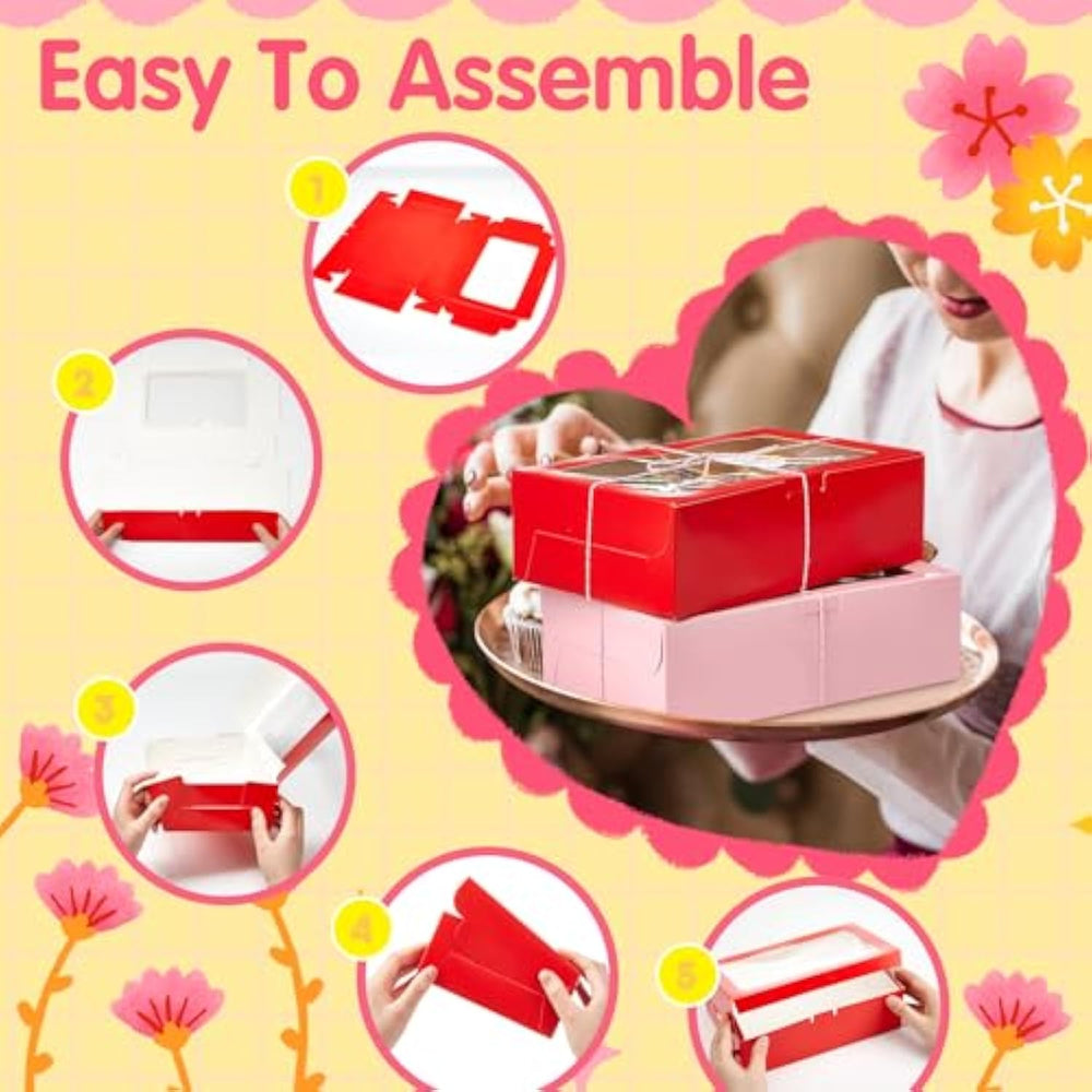 | Festival Set: Our Cookie Box With Window Set Includes 50 Pieces Boxes, 3 Bundles Of Ropes, And 50 Pieces Love Cards; Provide A Pleasant And Enjoyable Experience For Many Of Your Large Gift Giving Needs | | Suitable Size: These Valentine'S Day Cupcake Boxes Are The Ideal Size For Many Delicacies, From Cupcakes And Cookies To Chocolate And Brownies; Each Valentine'S Day Snack Box Measures About 9.45 X 6.1 X 2.95 Inches/ 24 X 15.5 X 7.5 Cm; Each Bundles Of Rope Measuring About About 32.8 Ft/ 10 Meters Long, 0.08 Inch/ 0.2 Cm In Diameter; Each Card Measuring About 1.97 X 1.97 Inches/ 5 X 5 Cm, Designed To Enhance The Charm Of Your Gift | | Quality Material: Our Gift Boxes And Ropes Are Mainly Made Of Cardboard And Polyester Cotton, Which Are Sturdy, Durable, And Easy To Use, Ensuring That They Maintain Their Shape And Appearance; The Gift Box Can Easily Accommodate Various Snacks And Desserts; The Rope Size Is Suitable For Firmly Tying The Box, And The Combination With The Card Further Enhances Their Attractiveness, Making Your Gift Look Irresistible | | Classic Style Design: These Bakery Boxes Adopts 2 Classic Valentine'S Day Themed Color Designs, With Each Color Provide 25 Pcs Box, Including Red And Pink; These Cookie Boxes Applied For Gift Giving Create A Vibrant Festive Atmosphere; Each Box Has A Beautiful Transparent Window, Allowing You To Catch A Glimpse Of The Tempting Cuisine Inside | | Widely Used: These Window Gift Box Can Be Applied For Various Purposes, As Creative Gift Boxes For Holiday Gifts, As Well As Selling And Showcasing Your Baked Goods And Takeaway Boxes; It Is An Ideal Companion For Valentine'S Day, Mother'S Day, Nurses' Day, Weddings, Birthdays, Parties, Bridal Showers, And Holiday Celebrations; You Can Also Use Cotton Ropes And Cards To Diy Your Baking Gift Box | |