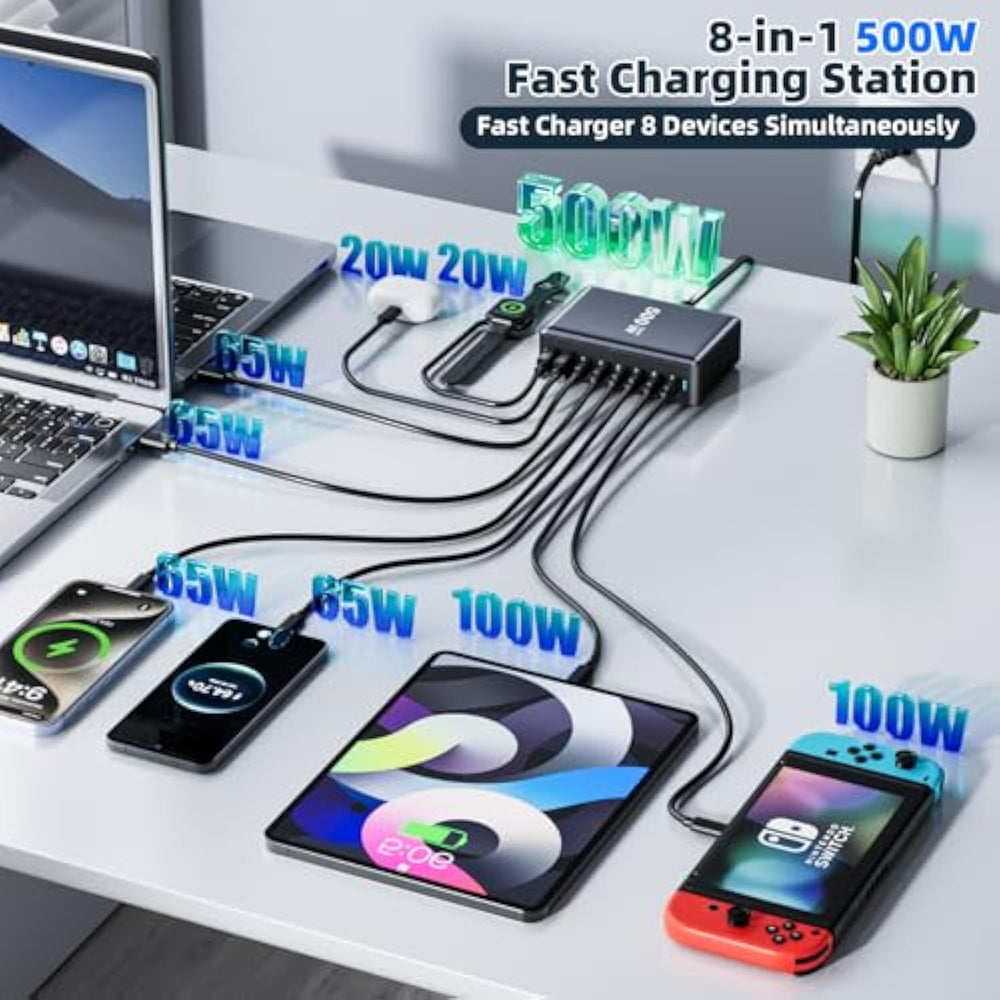 | 8-In-1 Charging Station: With 8 Ports, This Charging Block Allows You To Charge Up To 8 Devices Simultaneously Without Clutter Or Inconvenience. Perfect For Families, Multi-Person Conferences, Classrooms, Or Offices, This Charging Station Keeps All Your Devices Organized And Fully Charged, Eliminating The Need For Separate Chargers For Each Gadget.(Also Equipped With A 240 Watt Braided Nylon Rapid Charge Cable Suitable For This Product'S Usb C Charging Port) | | High Power And Fast Charging: Powered By Gan³ Technology, This Charger Block Provides Exceptional Charging Performance, Delivering 500W Of Power For Fast And Efficient Charging. The Usb-C Ports Are Engineered To Support High-Wattage Charging, Capable Of Charging A Variety Of Devices Like Smartphones, Tablets, Laptops, And More Without The Need For Multiple Chargers Or Adapters. | | Universal Compatibility: The 8-In-1 Usb-C Charger Is Compatible With A Wide Range Of Devices Including Smartphones, Laptops, And Tablets. This Includes Popular Models Like: Iphone Series, Samsung Galaxy Series, Google, Lg, Sony, Huawei, And More Smartphones, Macbook Series, Ipad Series, Samsung Tab Series, And Other Tablets And Laptops. | | Safety First With Multi-Layer Protection: Designed With Your Safety In Mind, The Usb-C Charger Block Features Built-In Multiple Safety Protections, Including: Over Voltage Protection, Over Current Protection, Over Charge Protection, Overheat Protection, Short Circuit Protection. These Safety Measures Ensure That Your Devices Are Protected From Power Surges And Overheating, Providing You With Peace Of Mind While Charging. | | Durable And Reliable Design: The Charging Station Is Built With A Strong Abs+Pc Shell For Durability, And Its Fireproof Material Offers Additional Protection, Ensuring The Charger Will Last For Years. With An Led Indicator Light, You Can Easily Monitor The Charging Status Of All Connected Devices At A Glance. | | Compact, Portable, And Convenient: Despite Its Powerful Performance, This Charger Block Is Compact And Lightweight, Making It Ideal For Travel, Home, Office, Or Café Use. Its Sleek Design Ensures It Takes Up Minimal Space, Allowing You To Keep Your Workspace Organized And Tidy. Perfect For Those Who Need To Charge Multiple Devices Without Dealing With Tangled Cables Or A Messy Setup. | | Eco-Friendly Gan³ Technology: Utilizing Gan³ (Gallium Nitride) Technology, The Charger Block Delivers Higher Efficiency And Lower Heat Generation, Allowing It To Remain Cool While Charging Your Devices. This Technology Not Only Improves Charging Speed But Also Makes The Device More Energy-Efficient, Contributing To A Greener Environment. | | Versatile Use For Various Situations: The 8-In-1 Usb-C Charger Block Is The Ultimate Solution For Your Charging Needs, Designed To Power Up To 8 Devices Simultaneously. Whether You'Re At Home, In The Office, Traveling, Or Hosting A Family Gathering, This Sleek And Compact Charging Station Offers The Convenience And Efficiency You Need To Stay Connected And Powered Up. | |