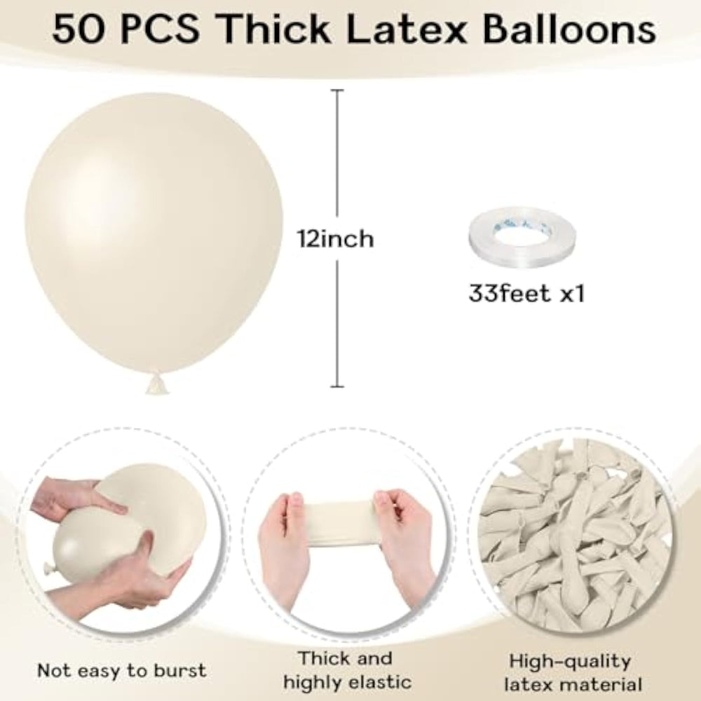 This cream balloon set includes 50 high-quality 12-inch latex balloons and a 33-foot ivory ribbon, perfect for creating elegant balloon arches or garlands. The soft taupe shade blends beautifully with a variety of color schemes, making it ideal for weddings, birthdays, gender reveals, baby showers, bridal showers, graduations, and holiday celebrations. Crafted from premium, non-toxic latex, these sand-colored balloons are durable and long-lasting, maintaining their shape and staying inflated throughout your event without the risk of bursting. Whether used indoors or outdoors, these balloons help create a stunning and memorable party atmosphere.
