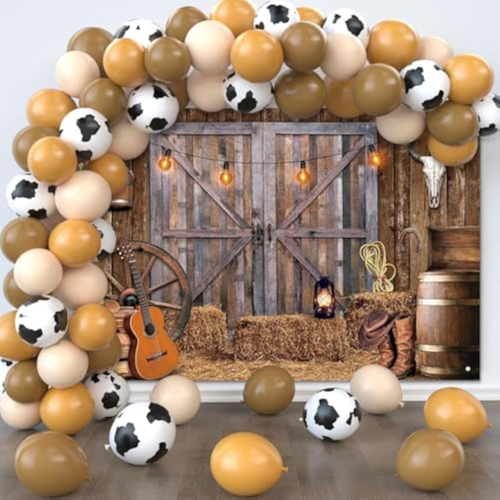 Throw the ultimate cowboy-themed celebration with this all-in-one Cowboy Party Decorations Set, which includes a retro western backdrop, 50 latex balloons in coordinating colors, adhesive dots, ribbon, and a balloon chain. Designed with classic western details like cowboy hats, wagon wheels, boots, barrels, and cacti, the banner brings an authentic Wild West vibe to your party. Easy to assemble, the set includes balloon tools for creating a garland and a pre-punched banner with rope for hassle-free hanging. Perfect for creating a fun and festive atmosphere, this set makes party prep quick, easy, and enjoyable.