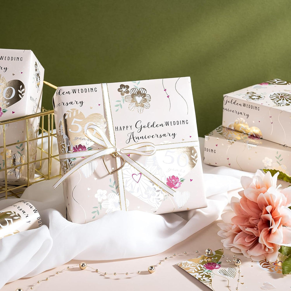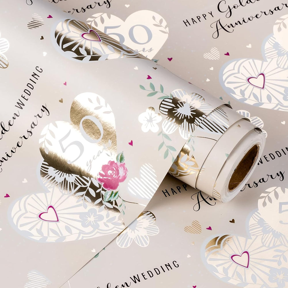 | Perfect Size: Each Roll Measures 17 Inches Wide By 33 Feet Long Golden Wedding Design: 50Th Anniversary Design, Gold Foil Heart, Florals And "50 Years Happy Golden Wedding Anniversary" Lettering Printed, Will Make Your Gift Beautiful And Shining Gridlines Design: Each One Features Gridlines On The Reverse Side For Straight Cutting And Perfectly Wrapped Presents. Premium Quality: Created With High-Quality Paper Materials, Thick And Not Easily Tear Or Rip, Item Came With Shrink Film To Prevent Wrapping Paper From Scratches And Reduce Dust Use All Occasion: Perfect For Golden Wedding, 50Th Anniversary, Valentine'S Day, Holiday, Party Gifts Wrap, It Is Also Great For A Craft Project