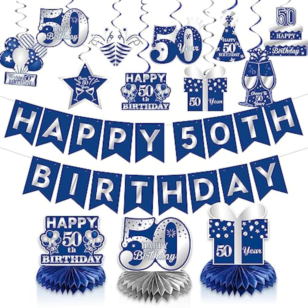 | ?Package Content?The Surprise Blue Silver Themed Package Includes 3 Honeycomb Centerpieces, 1 Happy 50Th Birthday Banner(Not Pre-String Banner,Need To Be Install), 10 Birthday Pattern Cards And 10 Hanging Swirls (Pre-String). A Variety Of Ornaments Are Available For You To Decorate. Let’S Celebrate 50 Year Old! | | ?Safety Material?This Set Of Blue 50Th Birthday Decorations Is Made Of Natural Paper, Odorless And Non-Fading, Making You Safe And Comfortable, It Is Suitable For Men Or Women And Can Be Used For Livingroom, Wall, Window Decorations. | | ?Easy To Assemble? "Happy 50Th Birthday" Banner Each Letter Card Has Pre-Cut Holes, It'S Easy To Follow The Hole To String The Banner By Plastic Needle. And Each Honeycomb Decor Comes With Self-Adhesive, Peel Off The Sticker And Stick It On The Card. | | ?Cheers To 50 Years? The Blue And Silver 50Th Birthday Decorations Can Be Applied For Indoor Or Outdoor Events, Use Them To Create The Memorable Event And Boost A Happy Atmosphere For Your Friends And Family! | | ?Unforgettable Party ?Blue 50 Year Party Supplies Create A Warm And Happy Atmosphere For You And Narrow The Distance Between You And Your Family And Friends. Any Question Will Be Solved Within 24 Hours. | |