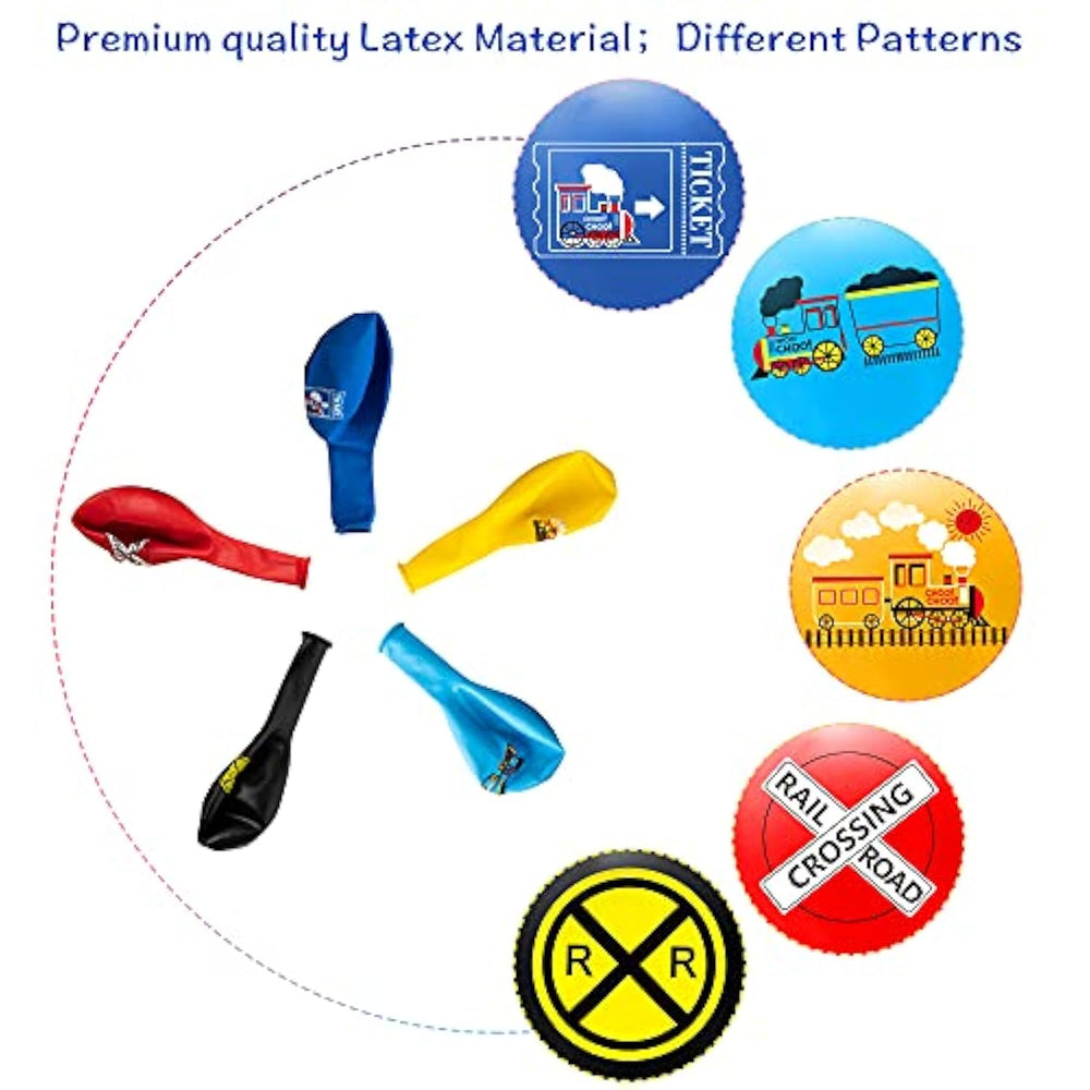 This colorful train-themed balloon set is perfect for your next party, featuring cute patterns like railroad crossing signs, choo choo trains, steam trains, and train tickets. These fun decorations will help set the perfect atmosphere for a memorable celebration. The set includes 50 balloons in five vibrant colors, light blue, deep blue, orange, red, and black, along with two rolls of ribbon for easy hanging. With a sufficient quantity of balloons, this set is perfect for decorating a complete party. Made from durable, high-quality latex, these balloons are strong and resistant to tearing, ensuring your decorations stay intact throughout the event.