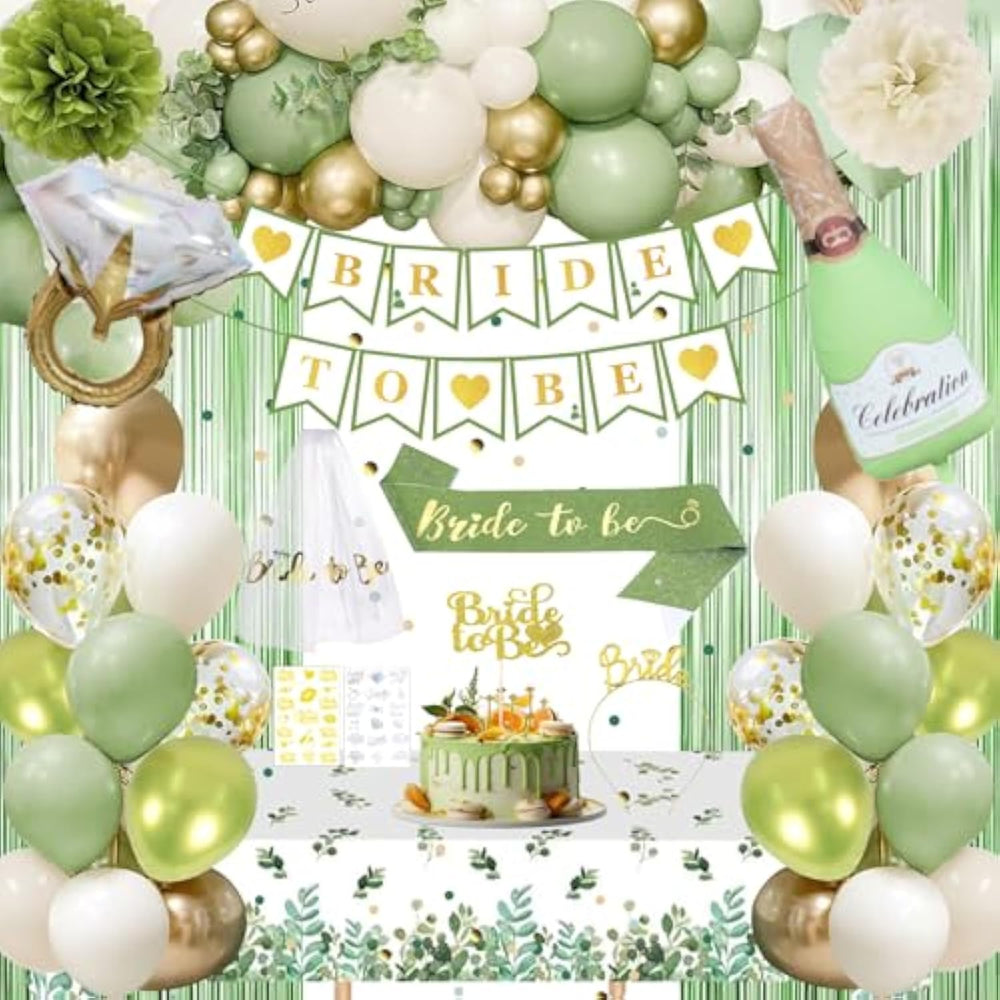 This bridal shower decoration kit is a complete set designed to make your celebration unforgettable. It includes a "Bride to Be" banner, a green satin sash, a gold tiara, a green and white tablecloth, and a rain curtain. You also get 15 sage green balloons, 10 gold metallic balloons, 5 sand white balloons, 5 green metallic balloons, and 5 gold confetti balloons, along with 2 foil balloons, 2 paper pom poms, and a cake topper. The kit also provides 10g of green and gold confetti, ribbon, glue, and a 16-foot balloon chain for easy decoration setup. Made from durable materials, including non-toxic latex and high-quality foil, the banner is crafted from metallic foil and cardstock for durability. The satin sash adds a touch of elegance to the party. With tools like balloon strips and adhesive, the setup process is quick and easy, allowing you to focus on enjoying your special day.