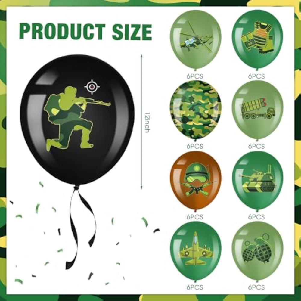 | Package Include: You Will Receive 54 Pieces Of Army Theme Balloons In 9 Styles, Sufficient Quantity And Rich Styles For Army Party Decoration And Replace Needs; The Balloons Set Fits The Theme Of The Army Party Event, Creating An Eye Catching And Memorable Atmosphere | | Army Theme Design: Our Camouflage Birthday Party Balloons Are Designed In Army Theme Elements, Such As Soldiers, Tanks, Camo And So On, Matches With Army Green, Full Of Energy And Passion; Prepare A Camo Party To Your Family Or Friends, And Will Add Vibrant Atmosphere For The Army Theme Party | | Material And Size: Our Military Camo Party Balloons Are Made Of Quality Latex, With A Smooth Surface, Thick And Durable, Not Easy To Fade Or Break, Can Retain Clear Colors For A Long Time; With Our 12 Inches Camo Party Decoration Balloons, Making Your Party An Unforgettable Military And Camouflage Celebration | | Easy To Use: Our Army Party Balloons Decorations Are Easy To Inflate And Deflate, Can Be Filled With Air And Helium; And It Can Be Placed Scattered Or Made Into Balloon Arches To Decorate Your Army Party; You Receive More Than Decoration Balloons, But Also Immersive Atmosphere And An Unforgettable Celebration Event, Coming And Making A Joyful Memory To Your Army Theme Party | | Wide Application: The Army Birthday Party Balloon Is Suitable For Green Camouflage Themed Party, Soldier Themed Party, Military Theme Party, Camo Hero Birthday Party, Soldier'S Graduation Ceremony, Army Themed Party And So On, Decorating With The Balloons For Your Party, And Creating A Lifelike Camo Atmosphere For Your Military Theme Activity | |