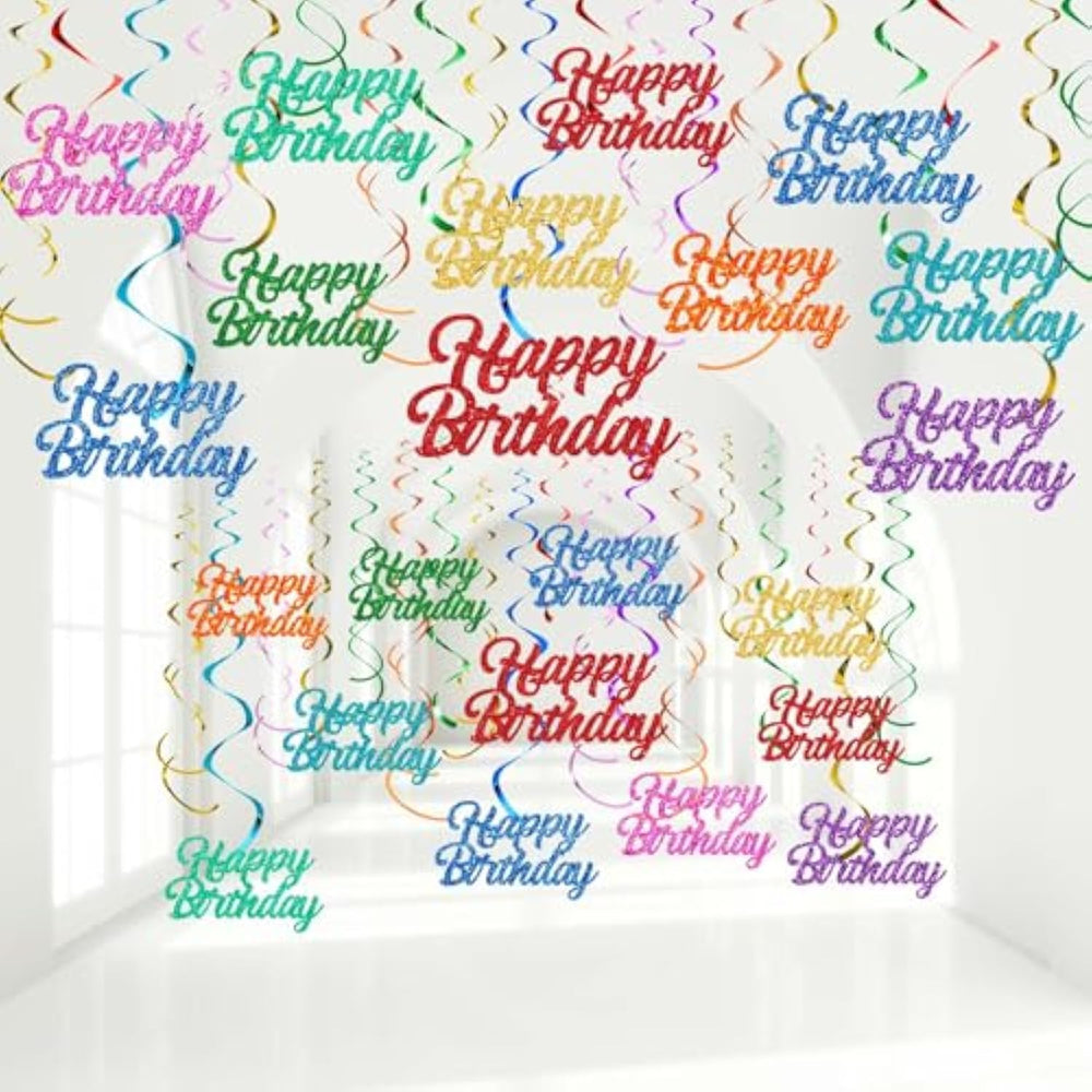 This set includes 27 glittery "Happy Birthday" hanging decorations in 9 vibrant colors and 30 ceiling swirls in 8 different colors, providing a colorful and lively atmosphere for your birthday celebration. Made from durable glitter paper, these decorations are sturdy, reusable, and resistant to fading or breaking. The "Happy Birthday" sign measures 7.87 x 4.13 inches, while the streamers stretch to about 39.37 inches, perfect for both indoor and outdoor settings. Easy to hang, you can quickly connect the spirals to the birthday ornaments, ensuring a sparkling and festive touch to your party decorations.