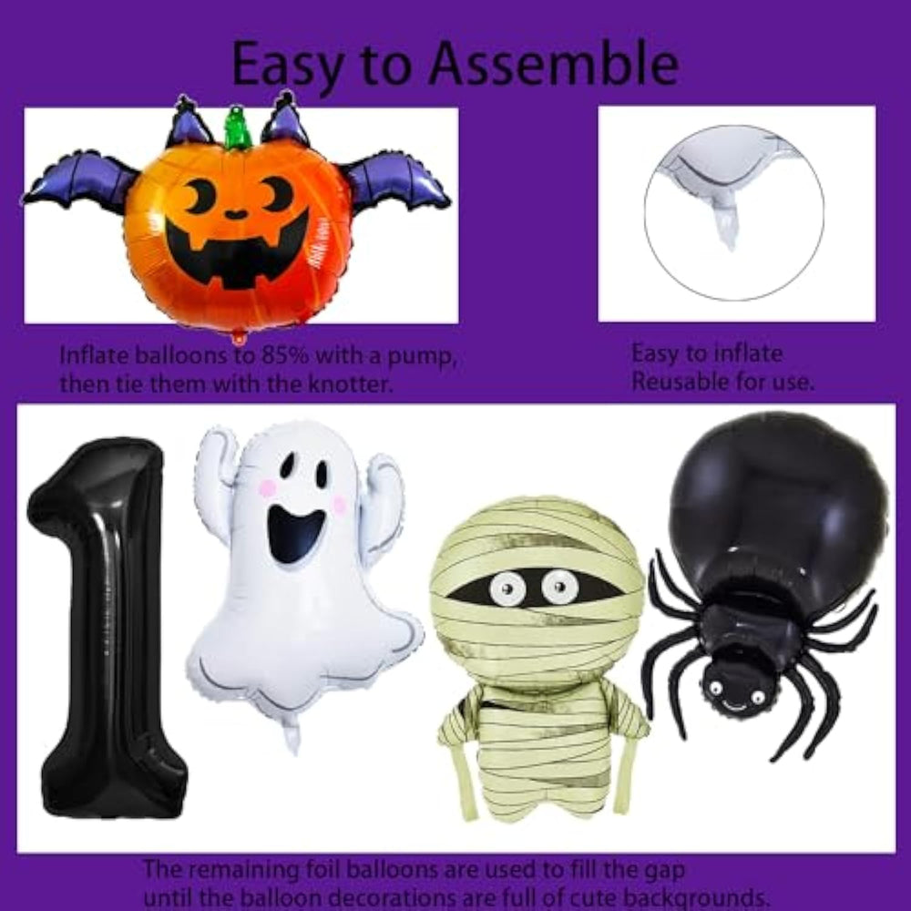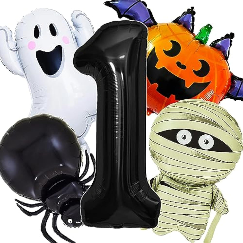 This Halloween birthday balloon set includes 5 large foil balloons: a black spider, mummy, ghost, pumpkin bat, and a 40" black number 1 balloon. With fun and spooky designs, this kit is perfect for adding excitement to birthday parties, baby showers, Halloween gatherings, or themed events. The mix of creepy and playful elements creates a festive atmosphere that guests will love. Made from durable, high-quality materials, these balloons are safe, long-lasting, and eye-catching, helping you set up a memorable Halloween birthday celebration with ease.