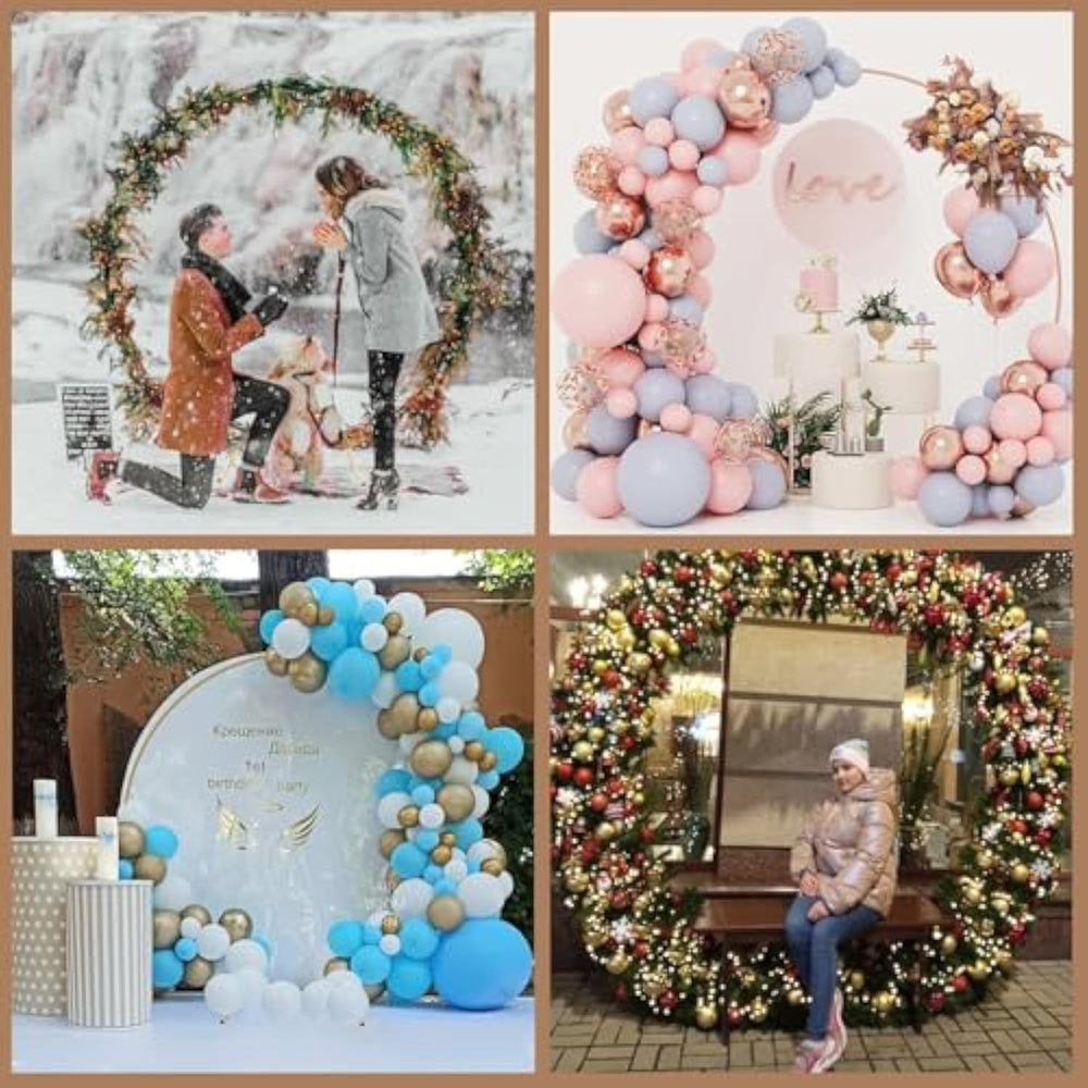 | ?Create A Unique Atmosphere?: When You Are Planning A Wedding Or Party, This Wedding Arch Will Be The Perfect Choice To Leave An Impressive Visual Effect And Create Unforgettable Memories For You And Your Guests. Feel Free To Decorate It On Your Special Day! You Can Decorate The Backdrop Stand For Parties With Flowers, Tulle,Decorations, Led Lights Or Other Elements, And Your Background Wall Will Be A Refreshing Focal Point To Add Romance And Happiness To Your Special Day | | ?High Quality And Sturdy?: The Wedding Arch Stand Is Made Of High Quality Metal Material With A Powder Coating To Ensure Durability, Corrosion Resistance And Long-Term Use To Ensure Its Beautiful Appearance For Years To Come. The Arch Backdrop Comes With 4 Ground Spikes To Enhance The Stability Of The Circle Arch Stand, Even In Uneven Ground Or Windy Weather Conditions, It Will Not Easily Topple Over, Thus Reducing The Risk Of Damage Caused By The Arch Toppling Over. | | ?Complete Party Package Includes?: 1×Round Balloon Arch Stand?14Pcs "A" Tube, "B" Tube, And "C" Tube.Note: Please Connect An A Tube Between Two B Tubes To Make The Round Stand More Stable?, 1×Storage Bag, 1 Balloon Arch Strips, 1×Manual. The Portable Storage Bag Can Easily Store The Removed Metal Arch Backdrop Stand, Which Can Save More Space, And Can Carry The Arch Kit Anywhere To Use. | | ?Great Circle Arch For Any Events?: Make Sure Your Party Is Memorable And Fun! This Gold Circle Arch Stand Is Perfect For Parties, Weddings, Graduations, Birthday Decorations, Baby Shows For Boys And Girls, Christmas Decorations, Commercial Celebrations, Store Promotions, Banquet Displays, Anniversary And Family Reunion Parties, Etc. It Is Versatile And Can Be Customized For Any Occasion Or Theme, Making It Your Best Party Decoration Partner Whenever There Is A Party Or Celebration | | ?Easy To Assemble?: The Circle Backdrop Stand Has A Diameter Of 6.6 Feet /2 Meters? An Overall Height Of 6.73 Feet?. With Screw Connection Design And Tools Included, It Can Be Easily Assembled And Disassembled By One Person. In Order To Ensure Smooth Assembly, Please Connect The Round Tubes In Turn According To The Instructions. If You Have Any Installation Or Other Problems, Please