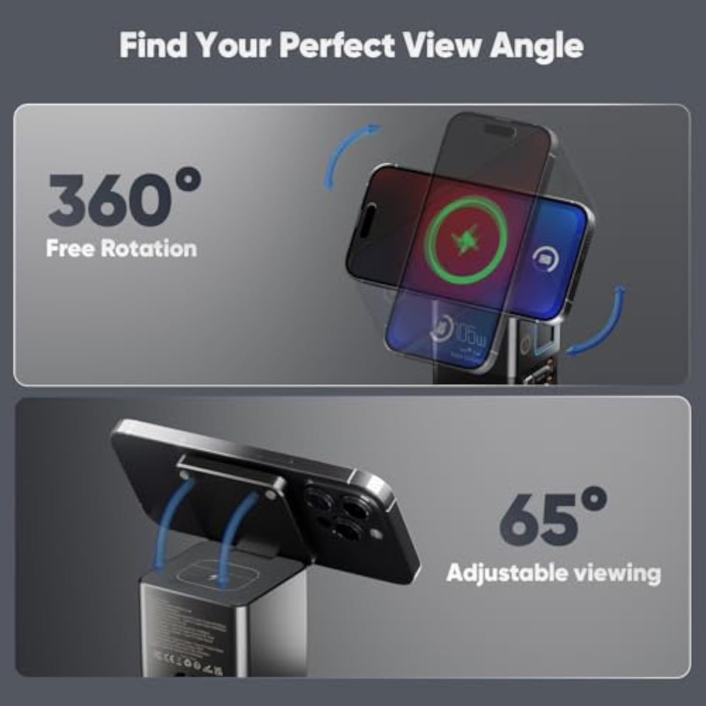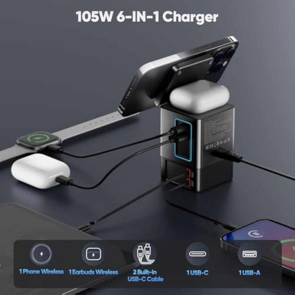| [105W 6-In-1 Wireless Charging Station] Power Up To 6 Devices At Once With This Space-Saving Charging Hub. Fast Wireless Charging: Compatible With 15W Magsafe For Iphone 16-12 + 5W For Airpods. Wired Charging: 2 Retractable 65W Usb-C Cables (Laptops/Tablets) + 1 Usb-C + 1 Usb-A Port. Total 105W Output - Charges Phones, Earbuds, Laptops, Tablets, And More. Keep Your Desk Tidy At Home, Work, Or On The Go With This All-In-One Solution. | | [Adjustable Viewing Angle (Up To 65°)] The Foldable Phone Wireless Charging Stand Offers 0-65° Tilt Adjustment, Designed For The Optimal Ergonomic Viewing Angle. Charge Your Phone Horizontally Or Verti