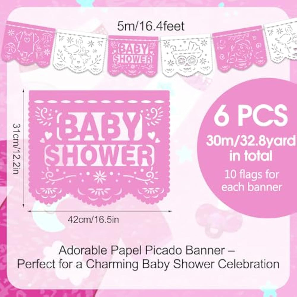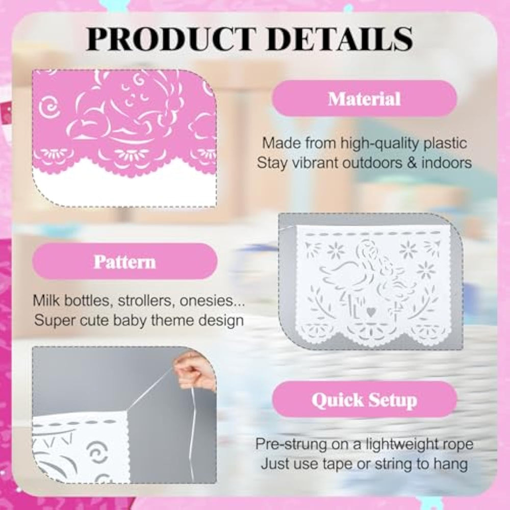 | Baby Shower Decor: This Set Includes 6 Beautifully Designed Pink And White Mexican Papel Picado Banners, Suitable For Baby Shower Parties; Each Banner Features Adorable Baby-Themed Elements Like Strollers, Feeding Bottles, And More, Adding A Festive Touch To Your Celebration | | Extra-Long Versatile: Each Baby Shower Banner Measures 5M (5.47 Yards), With A Total Length Of 30M (32.81 Yards); Hang Them In Rows, Crisscross, Or Tie Them Together For A Stunning Backdrop, The 42X31Cm (16.54X12.2In) Flags Will Create A Bold, Eye-Catching Display | | Durable Weather-Resistant: Made From High-Quality Plastic, These Banners Are Fade-Resistant And Sturdy, Ensuring They Stay Vibrant Outdoors Or Indoors; No Worries About Wind Or Light Rain - Your Party Decor Will Remain Flawless | | Easy To Hang Customize: Pre-Strung On A Lightweight Rope For Quick Setup - Just Use Tape Or String; Trim To Your Desired Length Or Connect Multiple Banners For A Longer Garland; Enjoy Effortless Decorating For Any Space | | Joyful Party Atmosphere: Bright Colors And Charming Baby-Themed Designs Instantly Elevate Your Baby Shower; Ideal For Photo Backdrops, Dessert Tables, Or Wall Decor, These Banners Create A Joyful And Memorable Celebration | |