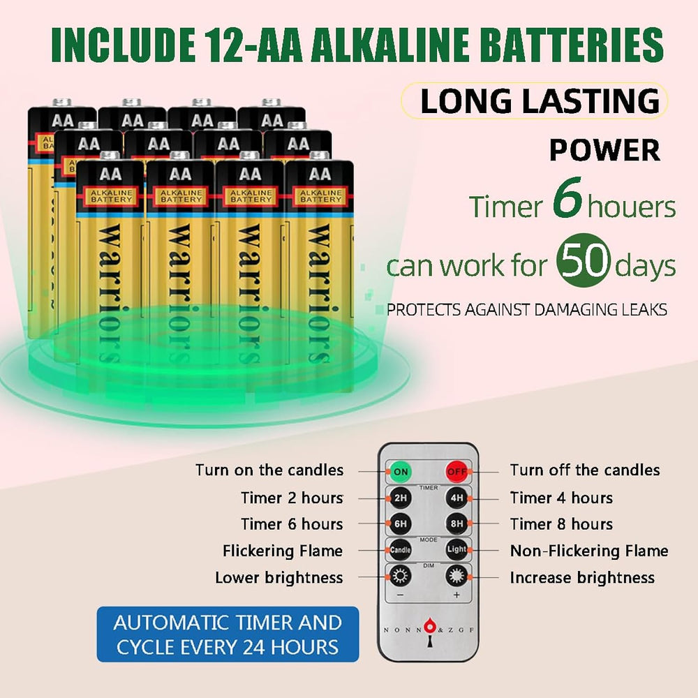 | Xxl Large Flame: The Newly Developed Flame Lamp Perfectly Reproduces The Shape And Size Of Real Flames. The Warm White Led Light Is Pretty. They Have A More Natural Flickering Light.Look And Behave More Like Real Candles, Add To The Ambiance Of The Holiday | | Battery Powered: Each Candle Needs 2 Aa Batteries, A Total Of 12(Included). The Included Battery Is High Capacity And Can Run More Than 400 Hours Continuously | | Size: Candle - 0.9" Diameter, 8.7" Hight; Candlestick - 2.4" Diameter, 1.5" Hight. No Fire, No Smoke, No Messy Dripping Wax. Much Safer And Cleaner Than Real Candles | | Remote / Timer: 10 Key Remote Control To Adjust The Candle Brightness, And The Candles With 2/4/6/8 Hours Timer Function, Cycling Every 24 Hours. Candle Will Turn Itself On Every Day At The Same Time And Enjoy Your Warm Time. The Distance Can Be 5 Meters | | Include: 6 Window Candles + 12 Aa Batteries + 6 Golden Candle Holders + 6 Suction Cups + 6 Decor Garland(With Bows/Bells) + 1 Remote Control. The Included Bows And Bells, Combined With Candles, Add A Celebratory Atmosphere To Your Christmas Or Holiday | |