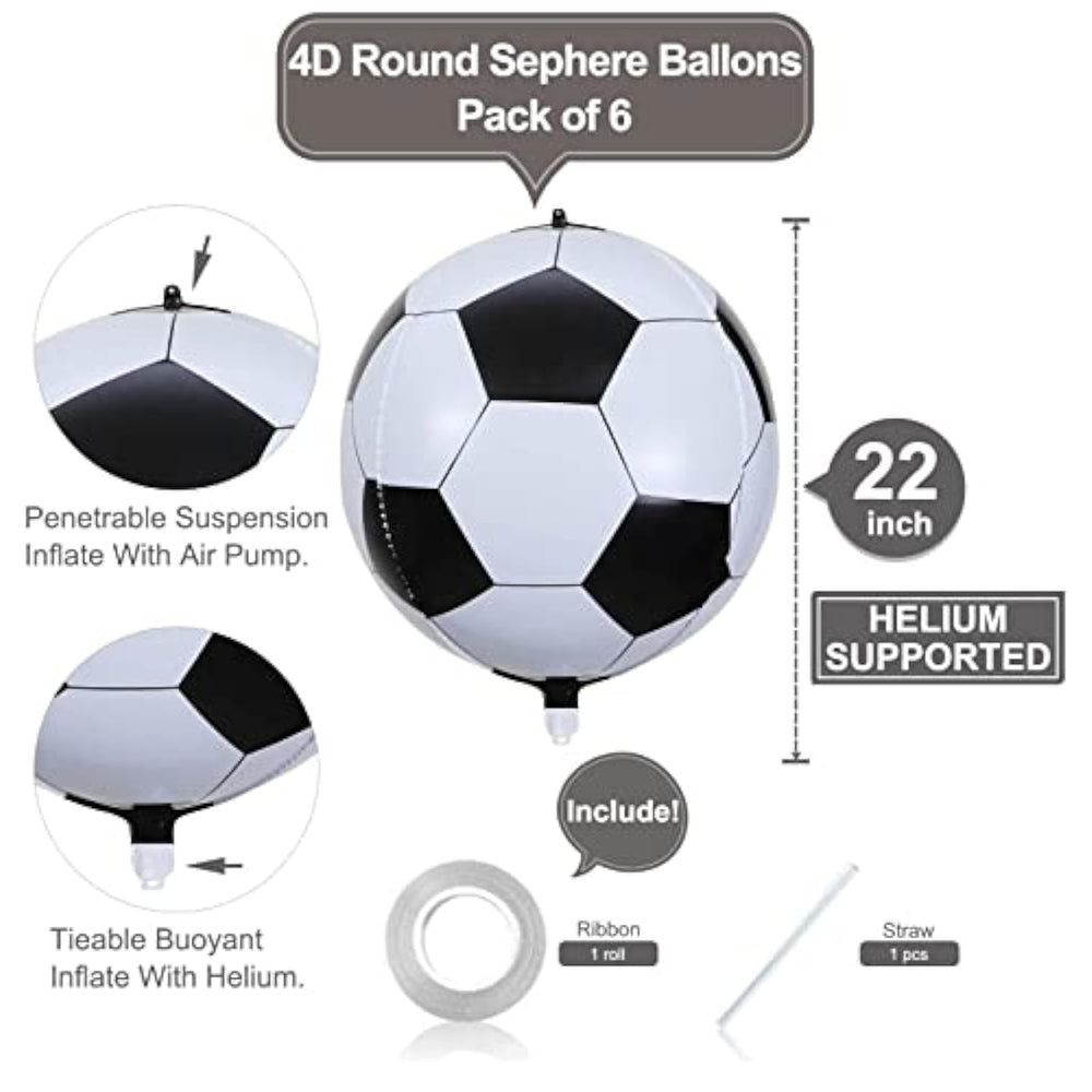 | Package Included:6Pcs 22 Inch 4D Soccer Foil Balloons (Uninflated) + 1Pcs Straw +1Pcs 32 Foot Ribbon Roll | | Material: High Quality Aluminum Foil.These Big Foil Mylar Balloons Can Be Supported Air Long Time Lasting. And They Are Reusable And Sturdy Enough And Not Easy To Pop. You Can Add These 4D Balloons On Arch Set Decorations And Add A Glamorous Effect To Your Party. | | Bright, Vibrant Mylar β Our Premium Quality Balloons Are Crafted With A Durable, Ultra-Shiny Aluminum Foil That Maintains Form Without Leaking Or Losing Air. | | Suitable: Inflate With Helium Or Air,Can Be Self-Sealed. | | Perfect Decorations For Sports Themed Birthday, World Cup Soccer Decorations, Foil Soccer Balloons Backdrop For Birthday, Kids Party, Graduation Or Gender Reveal Football Birthday Decoration. | |