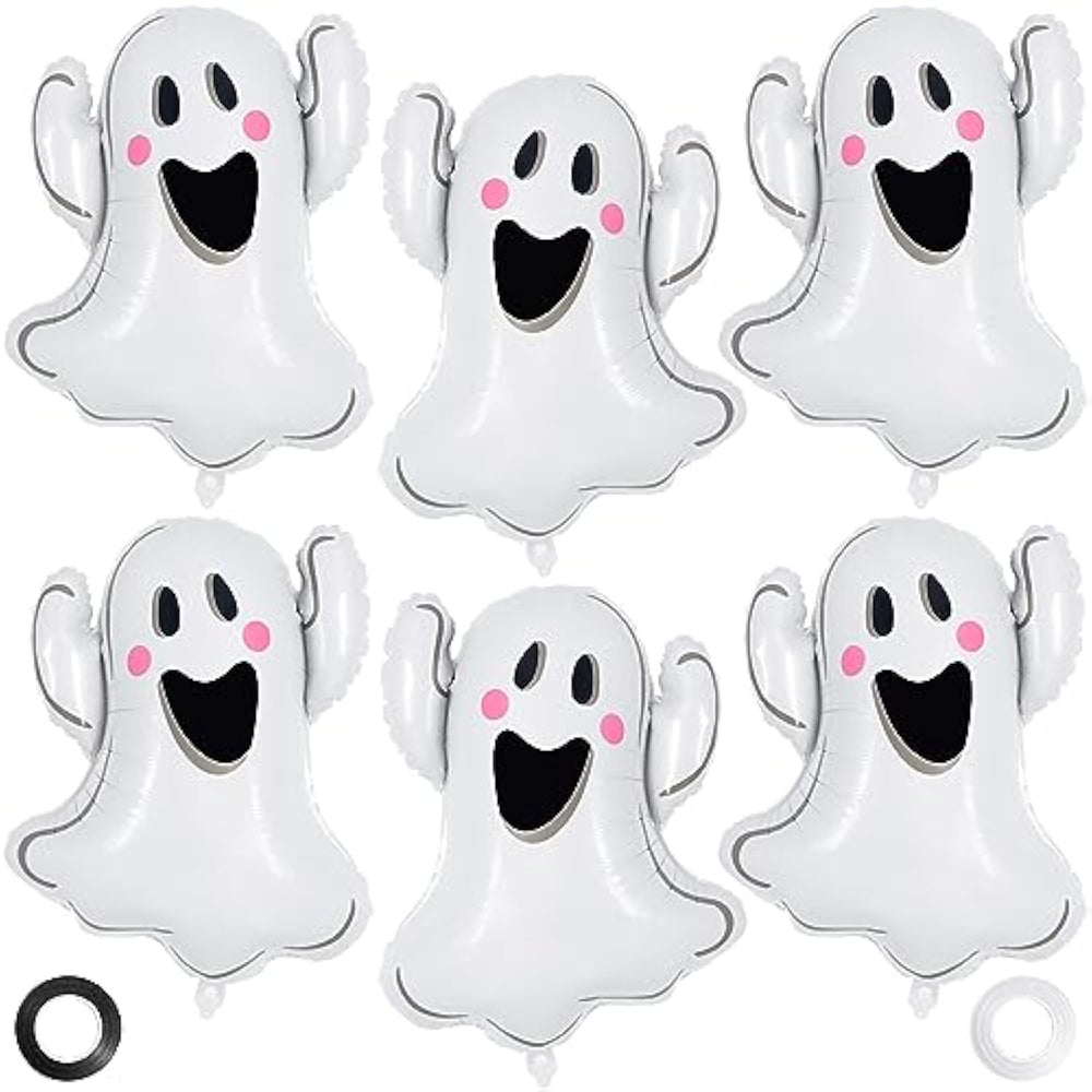 This Halloween balloon set includes 6 large foil ghost balloons, each about 32 inches tall, along with 2 rolls of ribbon (32.8 feet each) for easy tying and hanging. Designed in a cute yet spooky white ghost shape, these balloons are perfect for adding a fun, eerie vibe to your Halloween party. Easy to inflate with air using a pump, the balloons feature a self-sealing design and can be tied with the included ribbons to hang on doors, windows, or walls, instantly creating a festive atmosphere. Ideal for pranks, “trick or treat,” or simply as eye-catching decorations, they make a fantastic gift for kids and a great addition to any Halloween celebration. For best results, inflate the balloons to about 90% capacity to avoid bursting and achieve the perfect look.
