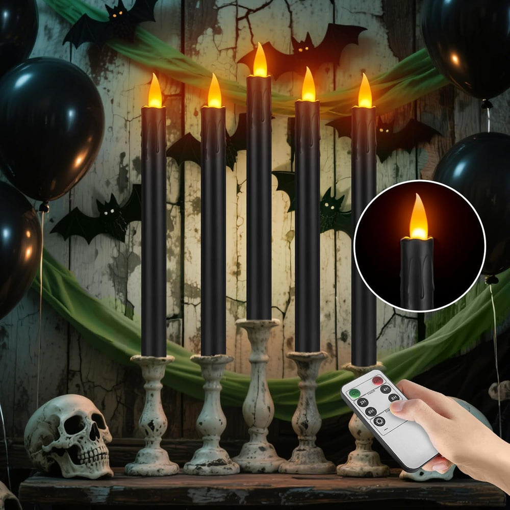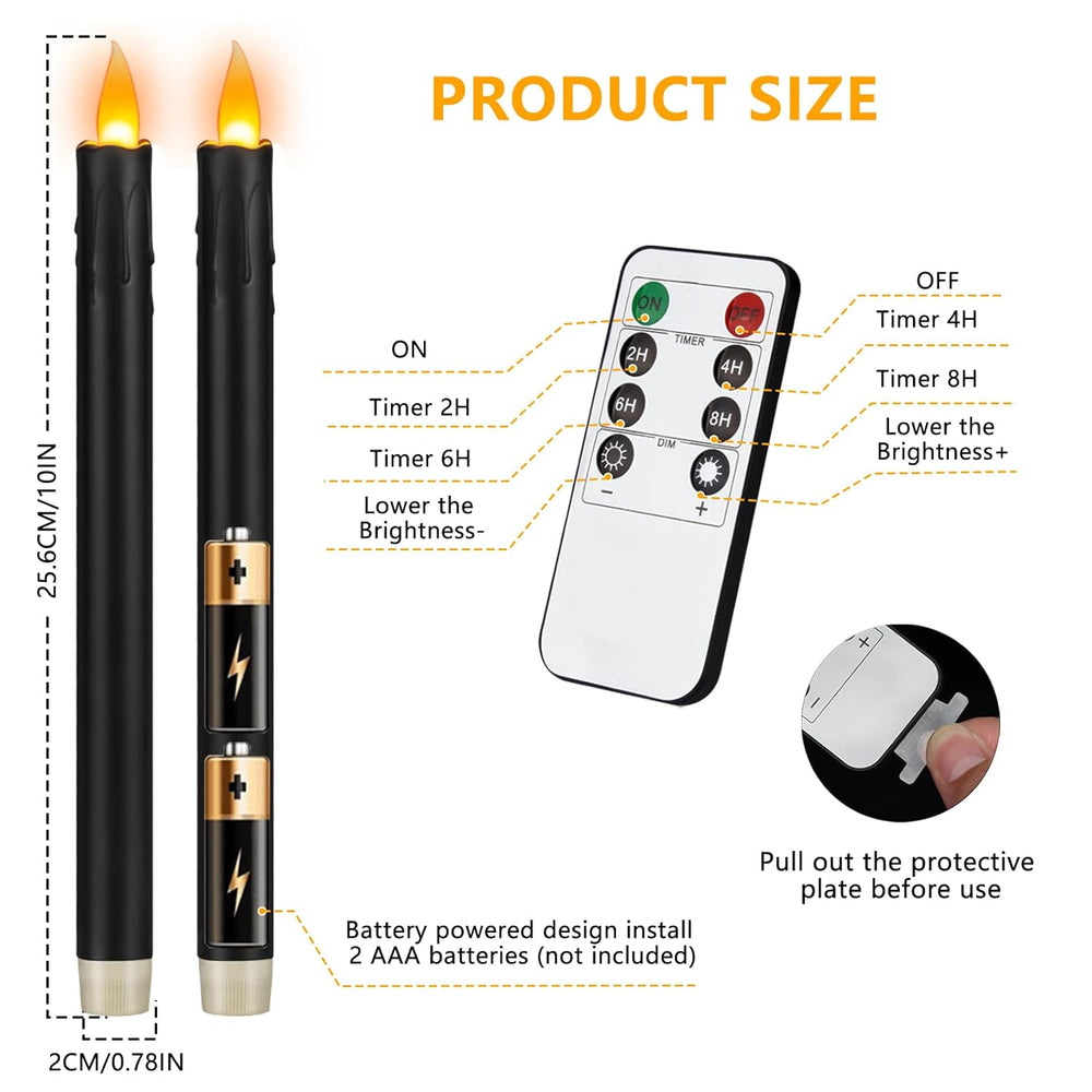 | Long-Lasting Taper Candle: Battery Operated Candles With Realistic 3D Wick, Perfectly Simulating The Real Flame. Led Candles Powered By 2 Aa Batteries (Not Included), Can Provide 400+ Hours Working Time. The Flickering Flameless Taper Candles Provide A Service Life Of More Than 50,000 Hours. | | 8 Key Smart Control: Flameless Taper Candles Comes With A Smart Remote. (1) Four Timer Modes(2/4/6/8 H), The Battery Led Candles Will Cycle Every 24 Hours Once Set. (2) Simple Brightness Adjustment. You Can Make The Flameless Candles Brighter Or Softer Depending On The Mood You Looking For. | | Secure And Convenient: Battery Taper Candles Is Made Of Plastic, Powered By Batteries, No Scent, No Dripping Wax, No Fire Flame, No Smoke, Won'T Melt. The Fake Led Candles Is Safe For Families With Pets Or Young Child, You Can Enjoy Beautiful Sleeping, Relaxing Time, Without The Worry Of Fire Hazard. | | Perfect Decoration: Battery Led Candlesticks Are Great For Decorating Bedroom, Living Room, Kitchen, Dining Room, Porch, Garden, Fireplace. Create A Warm Atmosphere At Christmas, New Year, Halloween,Valentine, Thanksgiving, Anniversaries, Wedding, Parties, Holidays With These Battery Operated Candles! | | Value Pack: 6 Pcs Black Fake Candles, 1 Remote Cantrol, 1 User Manual. Single Taper Candle Size Is Height 10" X Diameter 0.78". Each Battery Operated Candle Is Thoroughly And Rigorously Tested Before Sale. If Any Problems During Use, Please