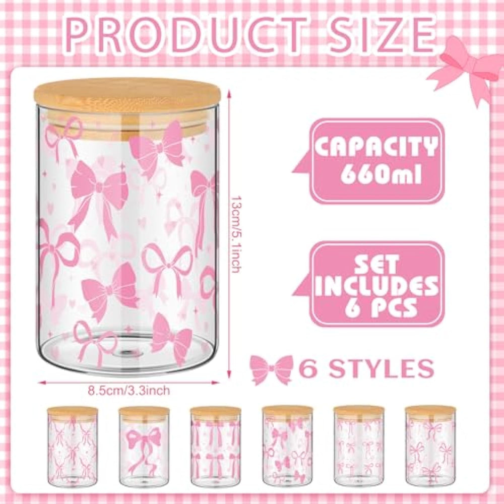 | Pink Bow Glass Food Storage Jars: These Valentines Glass Storage Jars With Airtight Lid Are Powerful And Attractive Looking, With 6 Different Pink Bow Patterns, The Set Includes 6 Pcs Glass Cookie Jars, Each Jar Has This Special Shape Of Cute Pink Bows On It, Promising To Add Elegant Charm To Your Home Or Kitchen | | Ample Storage Space: Glass Food Storage Jars Have Suitable Size, About 5.12 X 3.35 Inches / 13 X 8.5 Cm, Each With A Capacity Of About 19 Oz; Such Ample Space Makes It Ideal For Convenient Storage Of Various Foods Or Other Daily Needs In Valentines' Day | | Strong Material: These Glass Storage Containers With Wood Lids Are Manufactured With The Durability Of The Material Fully Considered, Composed Of Strong Glass Bodies And Equally Strong Wooden Covers; These Materials Not Only Have High Temperature Resistance, But Also Have A Smooth Surface To Ensure Long-Term Use | | Leak-Proof Storage Design: These Glass Cookie Jars With Lids Airtight Are Leak-Proof In Design, Ensuring Safe Storage With Wide Opening Systems That Are Easy To Fill And Clean, Making Them A Practical Addition To Your Daily Necessities | | Versatile Applications Needs: Our Kitchen Storage Containers Glass Are Not Only Suitable For Food Storage, But Also Ideal For Storing Common Household Items Such As Hairpins, Clothespins, Dental Floss, Cotton Swabs And Cotton Balls; Their Wide Range Of Applications Can Meet Most Storage Needs, Suitable For Winter, Christmas, Birthday And Daily Occasions | |