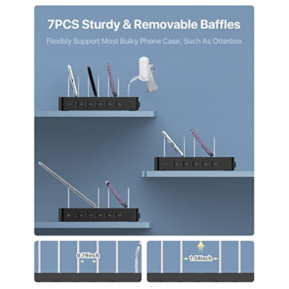 | ?Tidy And Organized?This Charging Dock With 6 Usb Port,It Support Charge 6 Devices Simultaneously. By The Phone Charging Station, No More Cluttered Cables And Do Not Have To Plug A Bunch Of Wall Chargers On Power Outlet, Keeps The Table Neat And Organize,And Freed Up Outlets In Home And Office. | | ?Usb-C Power Delivery Charging?This Multi Charging Station Feature One 20W Usb-C Fast Charging Port, Which Can Work For Lphone, Ipad, Samsung, And Other Electronics That Comply With The Pd Fast Charging Protocol.Charging Your Phones To 50% In Just 30Minutes, That Is 3 Times Faster Than Old Official 5W Charger, Saving Your Time And Never Let Your Devices Power Off. | | ?Removable Dividers Upgraded 2-In-1 Holder?With 7Pcs Sturdy And Removable Dividers,7Pcs For Phones And Tablets,1Pcs 2-In-1 New Holder For I Watch Air-Pods Charger,0.79Inch Wide Space To Support More Bulky Phone Cases,Like Otterbox.(The I Watch Charger Is Not Included). | | ?Advanced Safety Features? Equipped With Our All New Activeshield Safety System To Offer Enhanced Protection. Features A Dynamic Temperature Sensor Which Actively Monitors Temperature, And Power Tuner Chip To Adjust Power Output To Safeguard All Your Connected Devices. | | ?6 Mixed Charging Cables Included?Our Charger Station Comes With 6 Charging Cables, Including 1 Usb-C To Usb-C Fast Charging Cables, 2 Type-C Cable, 2 Usb-A To Lphone Cable, And 1 Micro Usb Cable. These Cables Allow You To Use Our Charging Station With A Variety Of Devices, As Well As Your Device'S Original Charging Cables. | |