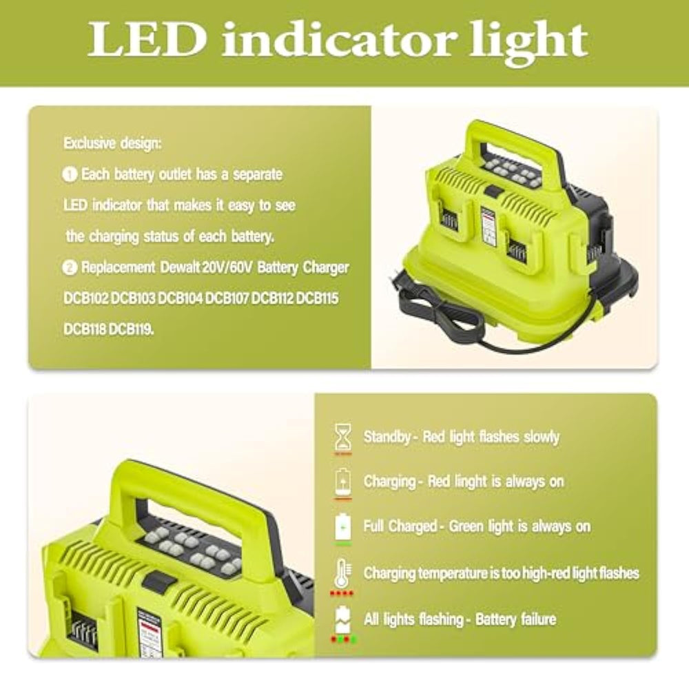 ??Ports Rapid Charger ?The Ports Rapid Charger Is A 6-Port Charging Station Designed To Replace The 20V/60V Devvalt Battery Charger. It Supports An Input Voltage Range Of Ac100V-240V 50/60Hz And An Output Voltage Of Dc21V 3A. Each Charging Port Features An Led Indicator, Allowing For Easy Battery Charging Monitoring. This Charger Is A Great Alternative To The Devvalt Fast Chargers Like Dcb102, Dcb104, And Dcb112. | | ??Widely Compatible ?6-Ports 20V/60V Rapid Battery Charger Replacement For Devvalt 20V/60V Battery Charger Dcb101 Dcb102 Dcb103 Dcb104 Dcb107 Dcb112 Dcb115 Dcb118 Dcb119 Dcb1800B, Compatible With Devvalt 20V/60V Lithium Battery Dcb181 Dcb180 Dcb200 Dcb201 Dcb203 Dcb204 Dcb205 Dcb206 Dcb606 Dcb612 Dcb606-2 Dcb609 Dcb609-2 Dcb612 Dcb615 Dcbp034-2 And More. | | ??Fast Charging Safety?It Charges Almost As Fast As The Original,You Can Fully Charge Your Dcb200 Battery In Less Than An Hour And Keep Your Work Going. Built-In Over-Cha.