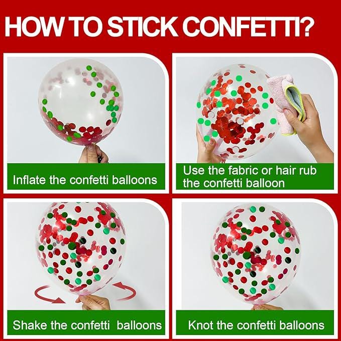 This Christmas balloon set includes 60 red and green latex balloons along with 2 ribbons, packaged in vacuum-sealed bags to prevent oxidation during transport. The balloons are easy to inflate and decorate using the included ribbons and adhesive dots, allowing quick setup for festive celebrations. Ideal for birthdays, baby showers, engagements, graduations, and weddings, these balloons add a cheerful and vibrant atmosphere to any event. For best results, avoid overfilling the confetti balloons and keep them away from heat or sharp objects.