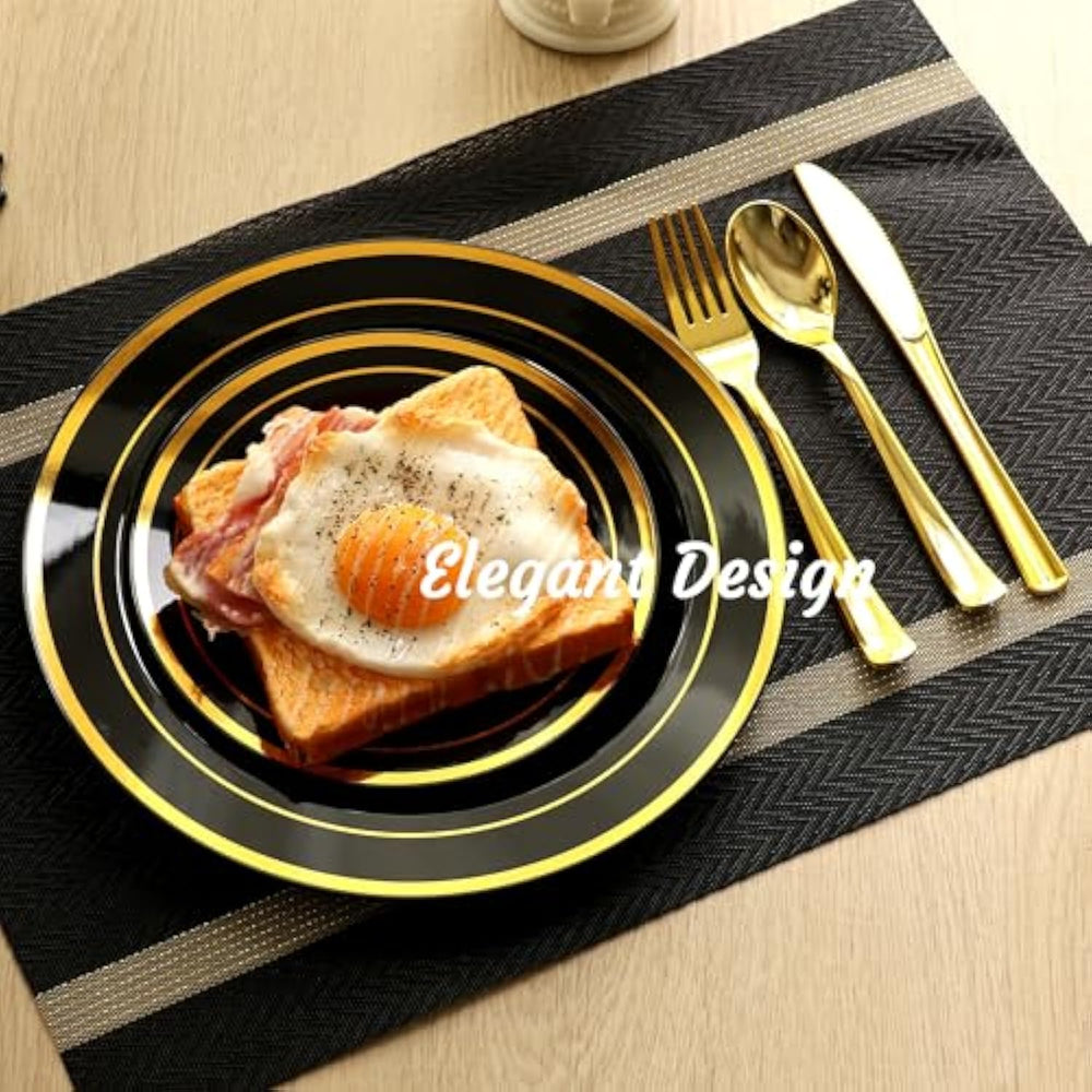 | 100% Bpa Free: These Black And Gold Plates Are Made Of Food-Grade Plastic That Is Bpa-Free. If You Want To Reuse These Plastic Plates, Please Simply Wash Them With Water. Important Note: For Better Use Of These Party Plates, It Is Not Recommended To Use Them In The Microwave Or Dishwasher. | | Elegant Design: This Black Plastic Plate, Paired With Exquisite Gold Edges, Presents A Modern Aesthetic Of Simplicity And Light Luxury. The Elegant Golden Edges Infuse The Dining Table With An Air Of Sophistication, Making It Particularly Suitable For Occasions That Pursue A Refined Lifestyle. These Black And Gold Plastic Plates Are Sure To Leave A Deep Impression On The Guests At The Event. | | Suitable For All Occasion: Perfect For All Parties Including Wedding Receptions, Engagement Parties, Baby Showers, Birthday Bashes, Anniversary Celebrations, Holiday, Prom Dinners, Business Gatherings, Cocktail Parties, Class Reunions, Family Dinners, Graduation And More. | | Easy To Clean: Our Vision Is To Create A Convenient And Exquisite Party For The Owners. This Black Disposable Plastic Plates Simplify The Cleaning After The Event, Allowing For More Time To Relax With Guests And Family. Their High Quality Ensures These Disposable Plates For Party Are Sturdy And Durable, And Can Be Reused After Cleaning To Maximize Their Value. | | Great Combination: You Will Receive A Great Plastic Party Plates Set, Including 30 Black Gold Dinner Plates And 30 Black Gold Salad Plates. The Thickened Packaging And Exquisite Elegant Design Also Make It Very Suitable As A Gift. | |