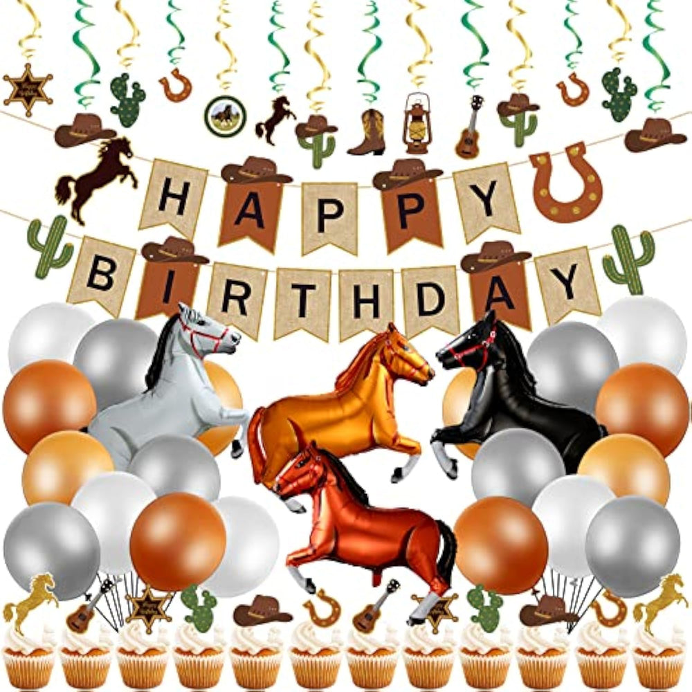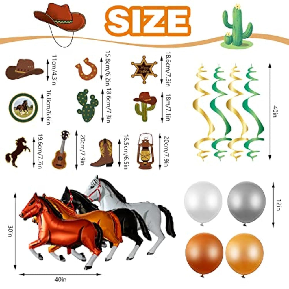 | Abundant Western Cowboy Party Decorations: 10 Hanging Swirls, 24 Cake Toppers, 2 Happy Birthday Banners, 4 Horse Shaped Balloons And 20 Latex Balloons (4 Colors, Namely Milk White, Grey, Light Brown And Brown), A Total Of 60 Pcs Of Cowboy Birthday Decorations, Which Are Sufficient To Meet Your Decoration Needs And Replacement | | Reliable Material: Each Horse Balloon Is Made Of Aluminium Film Material, Which Is Not Easy To Burst Or Fade, Assuring Your Long Time Use; Please Take Note That The Horse Shaped Balloon Can Not Float In The Air, Please Inflate Slowly To Prevent The Balloon From Bursting | | Large Size: Each Cowboy Balloon Is About 103 X 75 Cm/ 40 X 30 Inches And Each Latex Balloon Is About 12 Inches, Large Enough To Attract People'S Attention Easily From A Long Distance, Creating A Nice Visual Effect And Increasing The Atmosphere To Some Extent | | Classic Western Cowboy Elements: These Western Cowboy Theme Party Decorations Are Full Of Classic Cool Cowboy Elements, Including Hats, Guitars, Shoes, Cactus, Lamps, Walking Boots And Horses, Which Are A Nice Combination To Make Your Party More Charming, Leaving An Impressive And Unforgettable Memory For Your Guests At The Same Time | | Ideal For Multiple Occasions: These Horse Birthday Balloons, Cupcake Toppers, Happy Birthday Banner And Hanging Swirls Are Interesting And Cool Horse Birthday Party Supplies, Especially Suitable For Western Cowboy Themed Parties, Friends Or Family Gatherings, Picnics And Other Outdoor Events, Creating A Jubilant And Exciting Atmosphere | |
