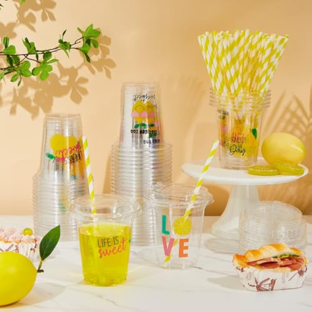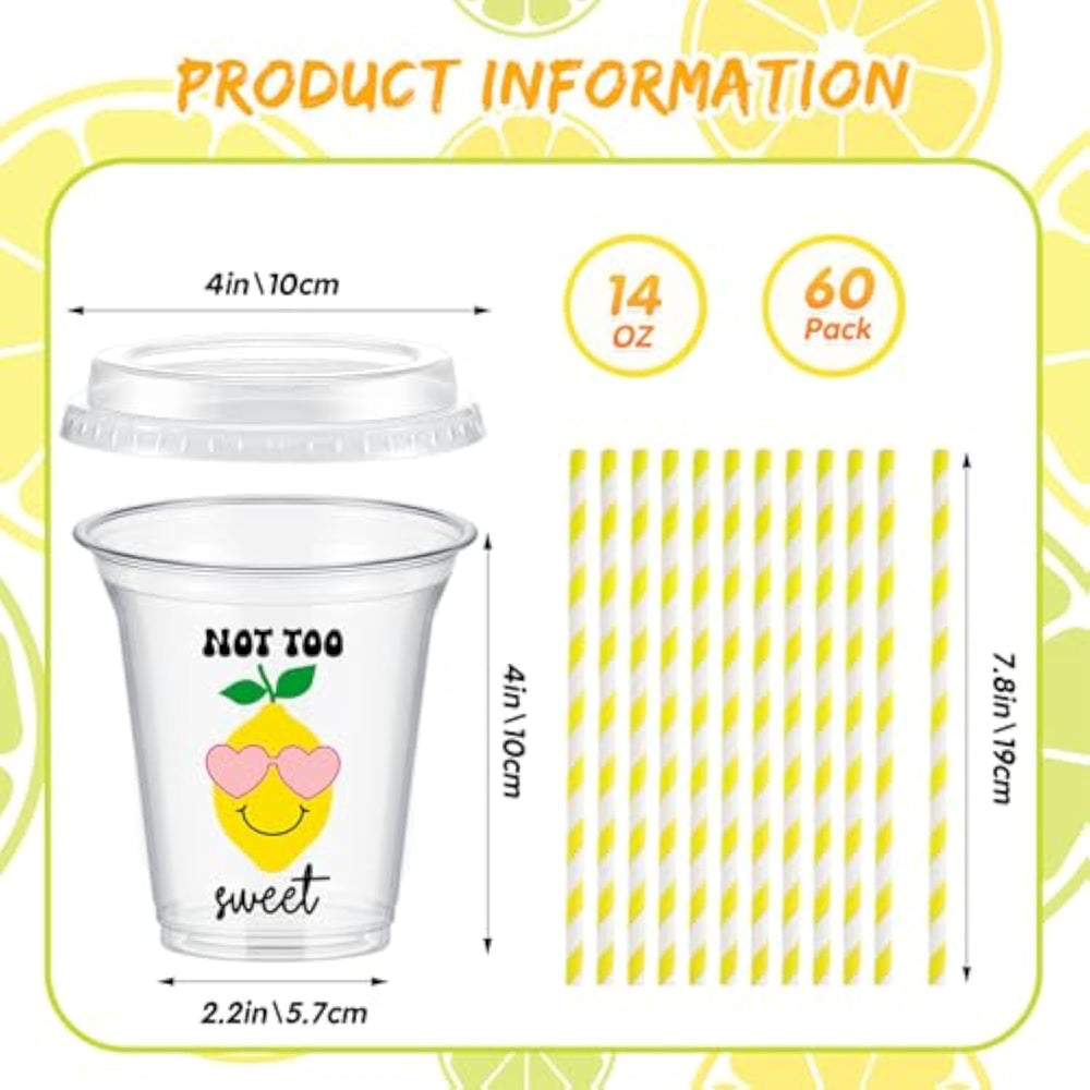 | Lemon Party Themed Patterns: You Will Receive 60 Disposable Cups With Matching Lids And Colorful Striped Paper Straws, Designed With 6 Distinct Lemon Party Themed Stickers; With A Variety Of 10 Pieces For Each Pattern, They Offer A Fun And Diverse Look For Your Gathering | | Reliable Pet Material: Crafted With Long Lasting And Thickened Pet Plastic, These Disposable Coffee Cups Ensure Reliability And Longevity; Also, The Included Straws Are Made With Paper, Equipped With 6 Color Combinations; The Cups' Material Is Thickened And Safe, Ensuring A Convenient Usage | | Ideal Size And Design: Enjoy Your Events With These Vibrant Plastic Cups With Lids And Straws That Sport Delightful And Eye Catching Lemon Party Designs That Match With Your Decorations; The Cups Are Approximately 3.98 X 3.86 Inches/ 10.1 X 9.8 Cm In Size, Providing A Comfortable Grip And Holding Capacity Of About 14 Oz | | Convenient Usage: These Disposable Cups With Lids And Straws Are Easily Disposable, You Can Simply Throw Them Away After Use And Enjoy More Time With Your Partners; Or, They Are Washable And Can Withstand Repeated Usage If You Wish To Use Them Again | | Versatile And Practical: These Plastic Cups Are Ideal To Hold Coffee, Wine, Beer, Cocktail, Beverages Or Other Cold Drinks; Their High Clarity Enhances The Presentation Of Your Beverages, Making Them Even More Enticing | |