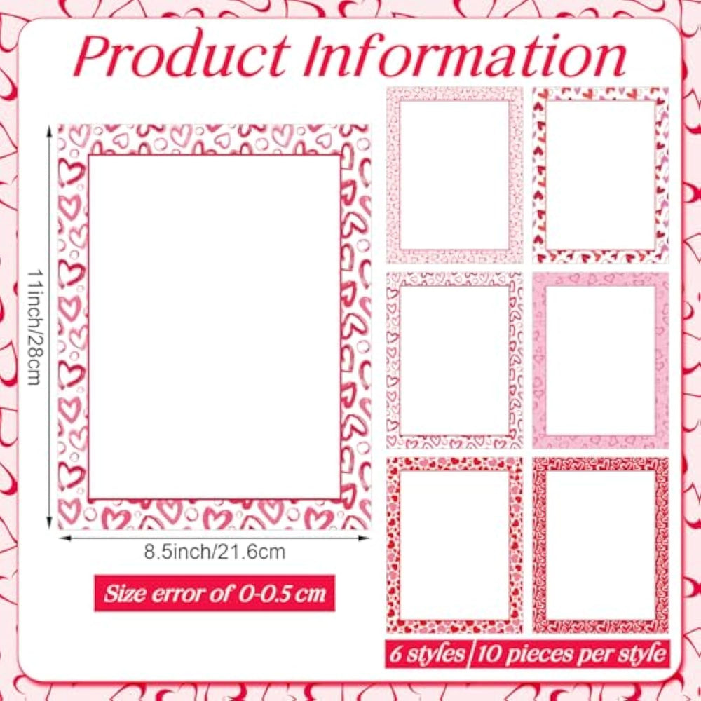 | Package Includes: You Will Receive 60 Pieces Of Valentine'S Day Stationary Paper In 6 Styles, With 10 Pieces Of Each Style, Sufficient For Your Valentine'S Day Print, Write, Diy Paper Crafts, And Share With Your Friends And Family | | Suitable Size: The Heart Letterhead Paper Measures About 8.5 X 11 Inches, Making It Compatible With Most Printers And Handling Various Printing Projects With Ease; They Can Also Be Applied To Make Greeting Cards, Party Invitations, Letters, Pictures, Schedules, And Other Creative Crafts | | Valentine'S Day Hearts Border Design: The Multipurpose Love Heart Border Letterhead Is Designed With Colorful Hearts And Cute Borders That Are Exquisite And Eye-Catching; The Center Is Blank Without Lines So That You Can Write Or Paint Letters And Patterns You Like Freely | | Thoughtful Gift: Attached Letters Or Notes Written On Our Valentines Heart Scrapbook Paper, Along With Writing Paper To Your Custom Gifts, With A Heartfelt Wonderful Touch; It'S Also A Nice Addition To Office Stationery Sets; This Letter Sheet Stationery Will Be A Delightful And Thoughtful Valentine'S Day Gift That Adds A Touch Of Charm To Their Holiday Correspondence | | Wide Application: Be It Family Invitations, Thank You Notes, Scrapbook Crafting, Invitations, Or Holiday Newsletters, Our Valentines Day Stationery Paper Meets Your Writing Needs; With Its Wide Application, This Decorative Paper Is An Adaptable And Versatile Option To Communicate Your Heartfelt Wishes During The Valentines Day | |