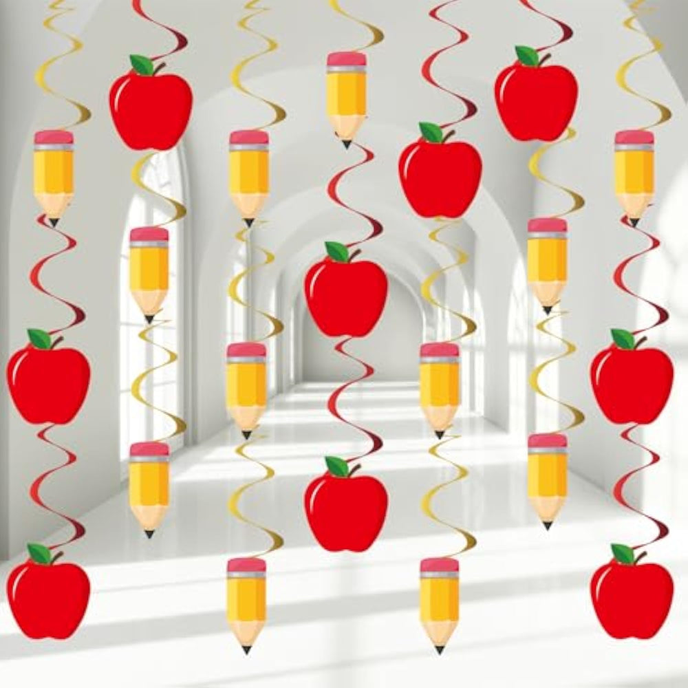 | Super Value Pack: You Will Get 28Pcs Apple Pencil Cards Decorations In 2 Different Patterns, And 32Pcs Red And Gold Foil Swirl Decorations. This Amount Is Enough For You To Decorate Your Party And Can Add A Fun And Festive Atmosphere. | | The Perfect Size And Material: The Back To School Ceiling Sign Hanging Decoration Size Is About 4.7*4.7Inches (12*12Cm), Made Of High-Quality Card, Waterproof, Not Easy To Wrinkle.And Each Foil Swirl Can Be Extend To About 24-28 Inches Long,Made Of Shiny And Durable Pvc,Not Easy To Hang And Bend, And Not Easy To Break. | | Exquisite Patterns: These Apple Pencil Cards Are Nice Supplies For Back To School Party Decorations. A Variety Of Cards Can Add A Great Ambiance To A School Theme Party. These Fun Party Decorations Provide The Perfect Decor And Backdrop For Your Party. | | Easy To Use: Each Foil Swirl Has A Clear Plastic Hook At The Top For Easy Hanging. All You Need To Do Is Gently Separate The Foils. Use The Hook To Connect The Spiral To The Card. Then You Can Hang It Anywhere To Create A Party Full Of Ambiance. | | Wide Applications: The Foil Swirl Decoration Set Is Used As Hanging Decoration For Welcome Back To School Theme Party, First Day Of School Party, And Birthday Party. You Can Hang It Indoors Or Outdoors. Use It To Decorate Your Walls, Windows, Doors, And Tree Branches. It Will Bring A Different Experience And Fun To Your Well-Prepared Party. | |