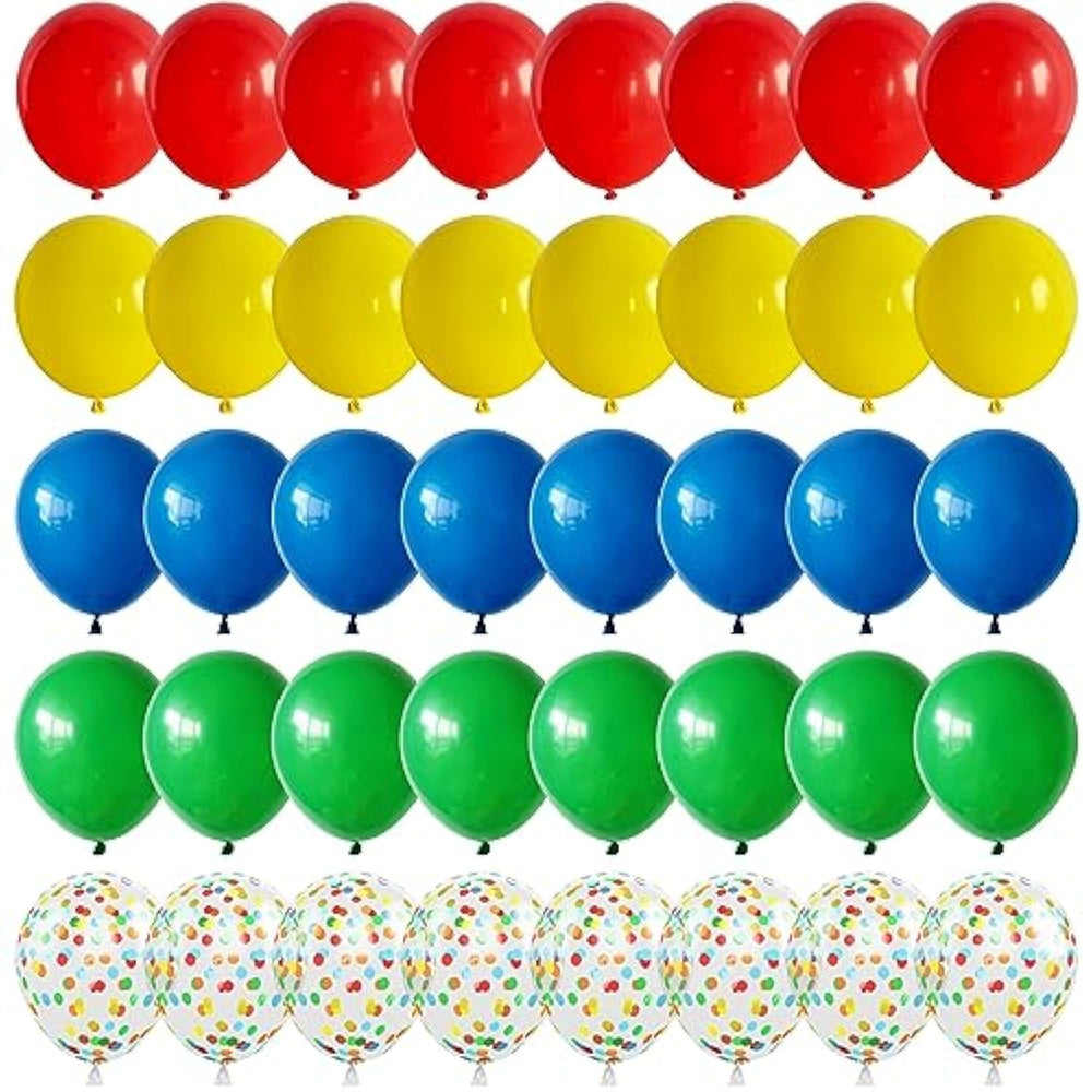 Bring vibrant color and festive energy to your celebration with this 60-piece rainbow balloon set. It includes a mix of matte red, yellow, dark blue, and dark green 12-inch balloons, plus glitter-filled red, yellow, and green confetti balloons, along with a roll of ribbon for decorating. Made from high-quality natural latex, these balloons are thick, durable, and safe for use with air or helium. Easy to assemble with included accessories, they’re perfect for creating arches, garlands, or balloon clusters for kids' birthdays, fiesta themes, or any joyful event.