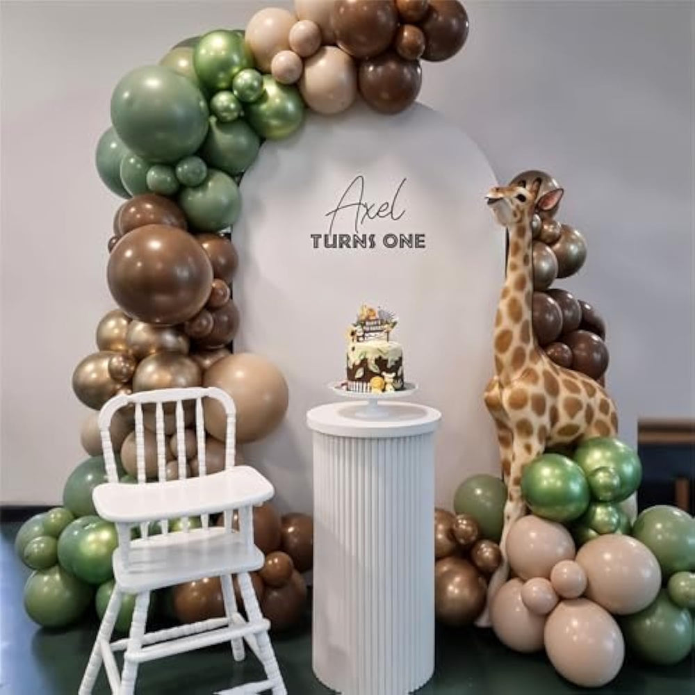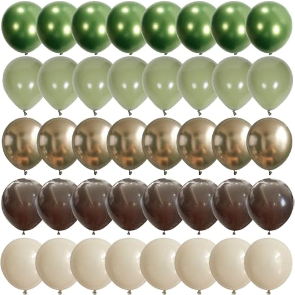 This camping balloon set includes 60 twelve inch helium balloons with 20 sage green 13 cocoa brown 12 beige cream 7 chrome gold and 8 chrome sage green balloons along with two curling ribbons in white and bright green Made from high quality natural latex these forest themed balloons are thick durable and safe for kids Perfect for creating balloon arches bouquets or backdrops this earthy tone balloon kit suits a wide range of occasions including jungle safari birthday parties baby showers camo army themes hunting parties and holiday celebrations like Christmas and New Year Use multiple packs for even more stunning decorative effects.