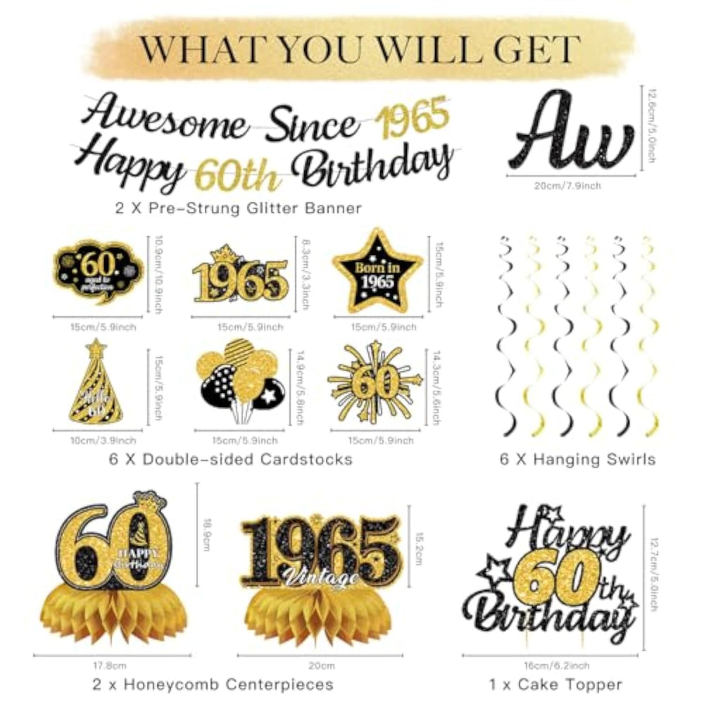 | Banner Comes Pre-Strung | | 60Th Birthday Decorations: 2Pcs Black Gold Glitter Banner,Including 1Pcs "Happy 60Th Birthday" Banner,1Pcs"Awesome Since 1965"?6Pcs Hanging Swirls,3Pcs Honeycombs Centerpieces, 3Pcs Cake Topper.They'Re Perfect For Decorating Your 60Th Birthday Party | | Unique Design: Retro Black And Gold Tones, With All Kinds Of Fun 60Th Birthday Party Elements, Banners, Swirls, Cake Picks And Honeycomb, Perfect For Both Small And Large Parties. | | Application Scenario: Suitable For 60Th Birthday Party Decorations. You Can Use Our Decorations To Decorate Walls, Ceilings, Dessert Tables, Mantels, Windows And More. It Can Meet Your Various Decorative Needs And Can Also Be Used As A Background For Photos. | | Easy To Assemble: Banners Come Pre-Strung, Swirls Have Pre-Cut Holes And Are Very Easy To Assemble Together; The Assembly Of The Honeycomb Is Also Simple, Tear Off The Stickers Of The Honeycomb Ball, Glue The Honeycomb Ball To The Fixed Area On The Card, Repeat On The Other Side Of The Card, And Finally Stand It On The Table. | | High Quality Material: Made Of High Quality Cardboard, Durable, Clear Printing, Light Weight, Easy To Carry, Reusable. | |