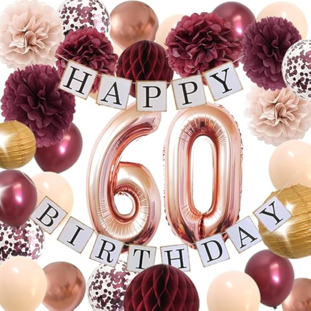 This 60th birthday decoration kit for women includes everything you need to create a stunning celebration. The set features a vintage-style "Happy Birthday" banner, jumbo 40-inch champagne gold number "60" balloons, six tissue flowers in burgundy, maroon, and champagne (two sizes: 10" and 12"), two 8-inch honeycombs, two 10-inch lanterns, and 40 matching balloons with floral accents, plus all the necessary accessories. Made with premium, eco-friendly materials, the balloons are non-toxic and sturdy. Easy to use, with helium-supported number balloons and pump-friendly latex balloons—perfect for creating a glamorous party setup.