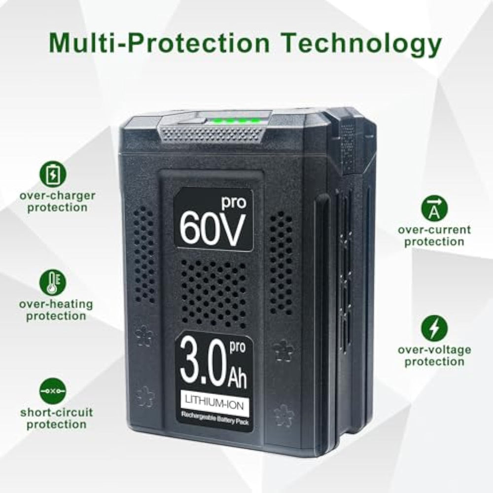 ?Product Specifications?Replacement For Greenworks 60V Battery| Type: Lithium-Ion, Voltage: 60V, Capacity: 3.0Ah. | | ?Widely Compatible? Replacement Battery For Greenworks Pro 60V Max Lithium Ion Battery Lb60A03 Lb60A00. Compatible With All Greenworks Pro 60V Max Cordless Tools Such As Greenworks Pro 60V Max Lawn Mower, Leaf Blower, Chainsaw And Snow Blower Etc. | | ?Widely Compatible? 60V Lithium Battery Replacement For Compatible With 60V Tools Lb60A00 Lb60A01 Lb60A03, Compatible With Lawn Mower Battery 60V Chargers Ch60R00 / 2951402 / G60X2Uc6 / 2928702 / G60Uc / 2936902 / 2958702. | | ?Safety Durablity? The Battery Replacement Approved Ce Fcc Rohs And Msds Certified, Built-In Intelligent Chip Can Over-Charge Protection, Over-Heating Protection, Short-Circuit Protection, Over-Current Protection, Overvoltage Protection, Avoid Excessive Use And Improve Tools Working Life. | | ?Service ? We Provide You 30-Day Money Back And 12-Month Limited Wa.