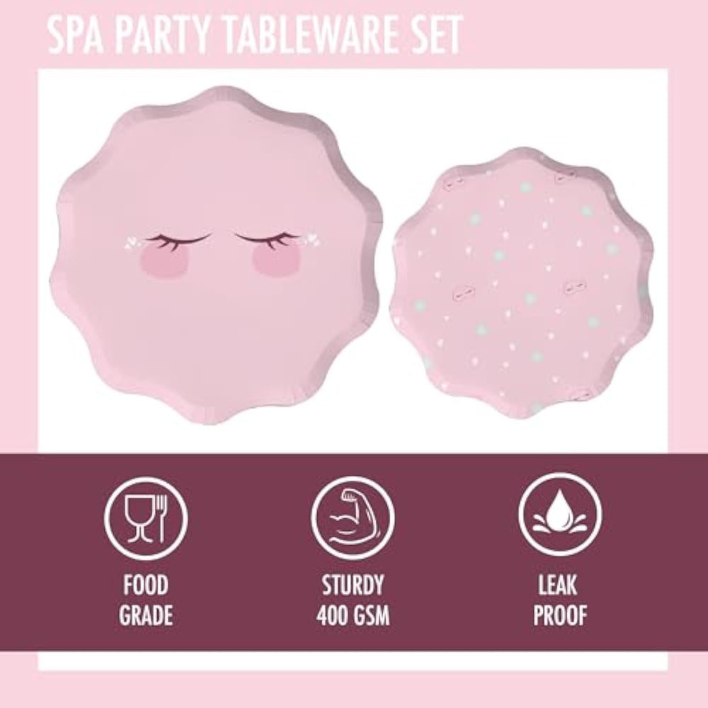 | **Comprehensive Spa Party Tableware Set** Our 64-Piece Spa Party Decorations Includes 16 Dinner Plates (10.5 Inches), 16 Dessert Plates (8.5 Inches), 16 Forks, And 16 Mask-Shaped Napkins. | | **Durable** Crafted From Premium Quality 400-Gsm Cardstock, These Cute Paper Plates Inch Are Also Heavy Duty Paper Plates, Sturdy Enough For Your Next Kids Spa Party And Sleepover Stuff. | | **Ideal As Spa Or Slumber Party Decorations** Features Perfect Combination Of Whimsical And Modern To Elevate Your Pink Party Decor With Stunning Spa-Themed Pink Party Plates And Napkins. | | **Perfect Sleepover Party Supplies For Girls** These Spa-Themed Birthday Decorations Featuring Cute Sleep Masks And Cucumbers Are The Perfect Pajama Party Decorations For Your Birthday Girl'S Sleepover. | | **Disposable Plates For Easy Cleanup** Make Post-Party Cleanup Easy With Our Disposable Plates, Napkins And Forks —Perfect As Slumber Party Supplies For Girls Looking To Enjoy More Fun And Less Mess. | | **Part Of Spa Party Collection** Perfect Spa Birthday Party Supplies For Girls, These Spa Party Plates Match The Popular Spa Party Decorations Collection. | |