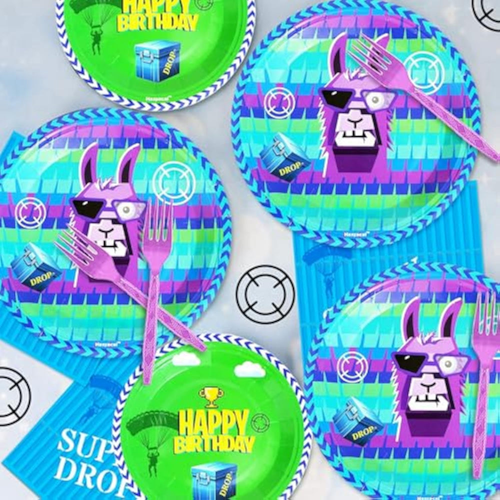 | Llama Plates Set Includes: This Video Games Disposable Dinnerware Total 64 Pieces, Includes 16 Pcs 9 ”Plates, 16 Pcs 7 ”Plates, 16 Pcs Forks, 16Pcs Napkins. | | Video Games Themed Party - Perfect For A Video Games Party, Gamer'S Game Theme Party, Birthday Party Tableware Set. Easily Make Your Party Full Of Atmosphere. It Will Make Your Party Full Of Fun. | | Convenience: You Can Simply Throw These Out When Making Cleaning Up After Party . Save Time And Effortless. The Design Is Diversified To Meet Your Different Needs. Let'S Spend More Time With Our Friends And Classmate. | | High Quality: It Is Made Of High-Quality Cardboard, Which Is Firm, Light, Odorless, Durable And Beautiful. It Can Be Displayed As Cake, Cupcake, Candy, Doughnut, Biscuit, Toy And Gift Tray At Your Child'S Birthday Party. | | ?Buy With Confidence? This Video Game Birthday Party Dinner Plate Set Is Your Right Choice, You Will Get High Quality And Fun. If You Have Any Questions About Damage, Shortage, Transportation Or Other Aspects, Please Feel Free To
