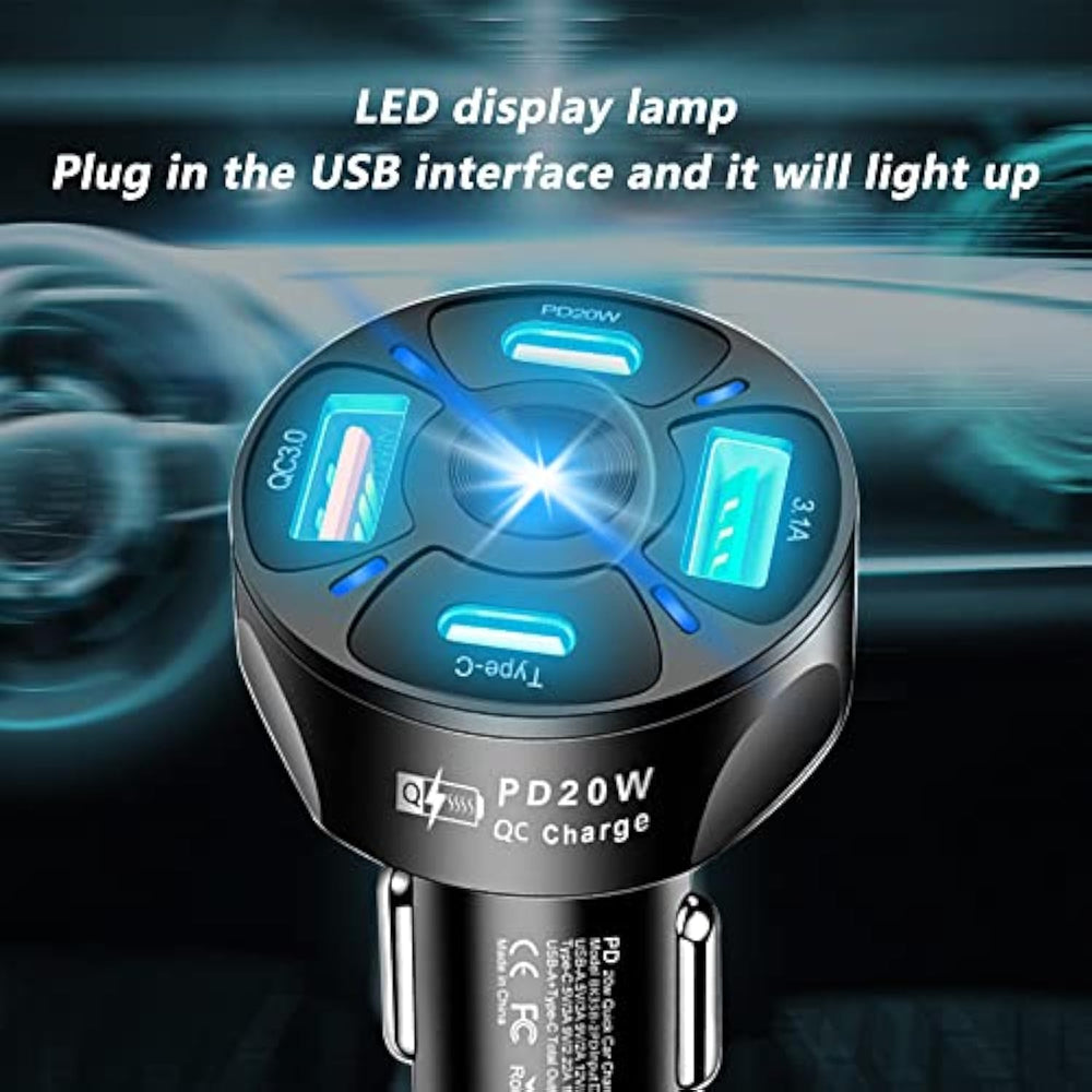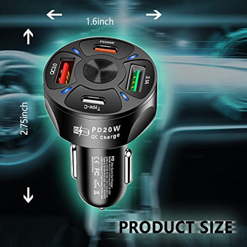 | Fast Charging: Our Fast Charger With Professional Flash Charger Cable For Faster And More Stable Charging, Cable Upgrade,Greater Efficiency, And Less Resistance.The Pd Port Can Reach A Maximum Output Of 20W,And Supports Both Type-C And Usb Ports,Allowing You To Charge Multiple Devices At Full Speed At The Same Time.Charging Time Is 30 Minutes And The Power Reaches 58%, So You Can Use Phone Comfortably All Day. | | High Quality Material: Our Car Charger Adapter Is Made Of Pc Flame Retardant Material Shell,The Usb Jack And Cigarette Lighter Port Have Been Tested By Our Team In More Than 40 Strict Tests,Scratch Resistant And Durable,With Good Flame Retardant Protection.To Do The Real Quality Assurance, Not Bad For A Long Time And Faster Heat Dissipation. | | Perfect Design: Ultra-Mini Body, Size Just 1.6*2.75Inch,Compact And Hidden In The Cigarette Lighter,The Black Shell Blends With Your Car'S Interior,Beautiful And Stylish,Without Affecting The Effective Compatibility With Various Cell Phones,Tablets,Car Recorders And Other Usb Devices.Widely Used In 12-24V Voltage Input Models,Including Family Cars, Business Suvs,Off-Road Sports Cars,Etc. | | Smart Ic: Our 4-In-1 Charger Has A Built-In Upgraded Smart Main Core Chip,Including Power Management Chip And Fast Charging Protocol Chip.It Prevents Dangerous Situations Such As Over Voltage,Over Current,Over Temperature And Over Power Short Circuit,And Also Intelligently Identifies Electronic Devices And Adjusts Current Output To Ensure Safe Charging While Driving. | | Led Light Display/Drop Protection: When The Car Charger Is Charging,It Will Have Led Light Display, You Don'T Need To Struggle To Find The Charging Port In The Dark Anymore,And The Light Adds To The Warm Atmosphere Inside The Car.It Adopts Three-Point Integrated Snap Fastening Design To Eliminate Poor
