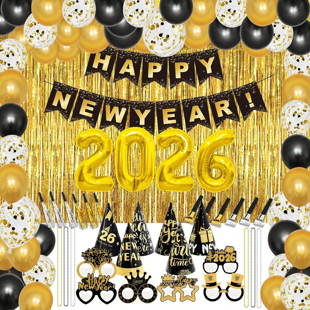 COMPLETE KIT:Celebrate the 2026 New Year in style with our all-inclusive New Year's Decorations Kit: 1 "Happy New Year" banner, 1 set of "2026" foil balloons, 2 gold foil streamers, 12 black latex balloons, 12 gold latex balloons, 8 confetti latex balloons, 1 black 3D balloon, 1 gold "Happy New Year" star foil balloon, and 1 black foil star balloon, 2 star-shaped foil balloons, 6 noise makers, 6 party hats, 6 New Year glasses, and 6 shiny gold necklaces. Perfect for creating an unforgettable atmosphere for your New Year's Eve party