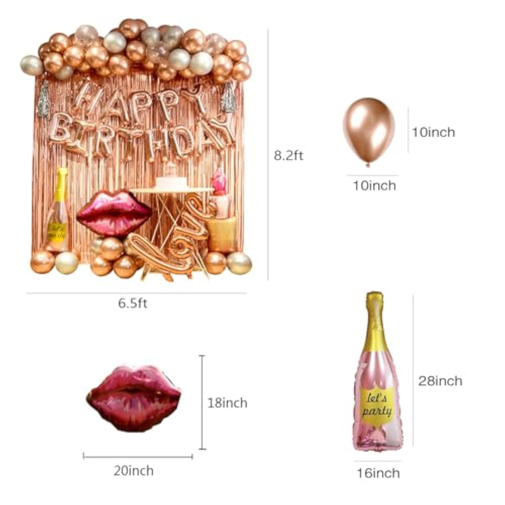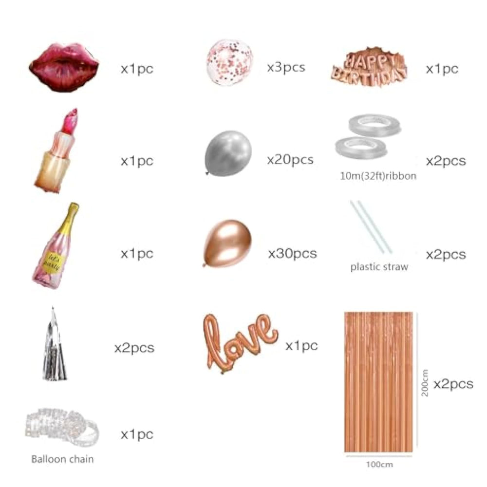 This rose gold birthday decoration set is perfect for women and girls, including a Happy Birthday banner, two large rose gold fringe curtains with adhesive backing for easy setup, a lip balloon, wine bottle balloon, lipstick balloon, balloon chain, three confetti balloons, 20 silver balloons, 30 rose gold balloons, a love balloon, two balloon straws, and two balloon ribbons. The aluminum and latex balloons are durable and support both air and helium inflation. For floating balloons, use pure helium, while foil balloons should be inflated with a straw. Create a stunning party backdrop with this elegant and easy-to-assemble set.