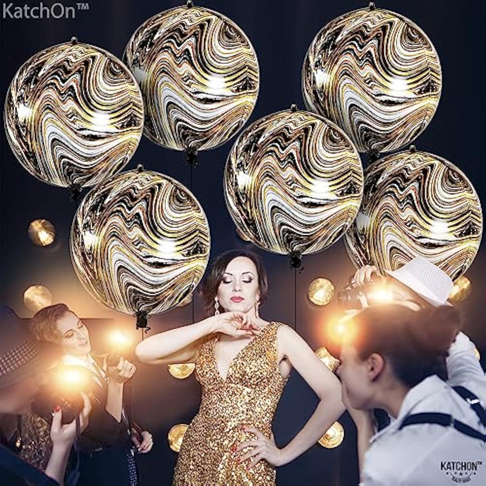 Make a bold statement with these stunning 22-inch Marble Black and Gold Balloons. Inspired by the elegance of black agate, these mesmerizing balloons feature a unique swirl pattern of gold and brown against a deep black background, creating a luxurious and eye-catching display. Perfect for elevating any celebration, these balloons add a touch of sophistication to birthdays, graduations, Hollywood-themed parties, and more. Each pack includes six high-quality, self-sealing balloons that are helium-supported for a long-lasting and impressive decoration. Made from durable, premium-grade materials, these balloons can be deflated and reused for future events. Whether you're decorating for a glamorous gold and black-themed party or adding a stylish twist to your décor, these marble balloons will turn any occasion into a stunning and unforgettable celebration.