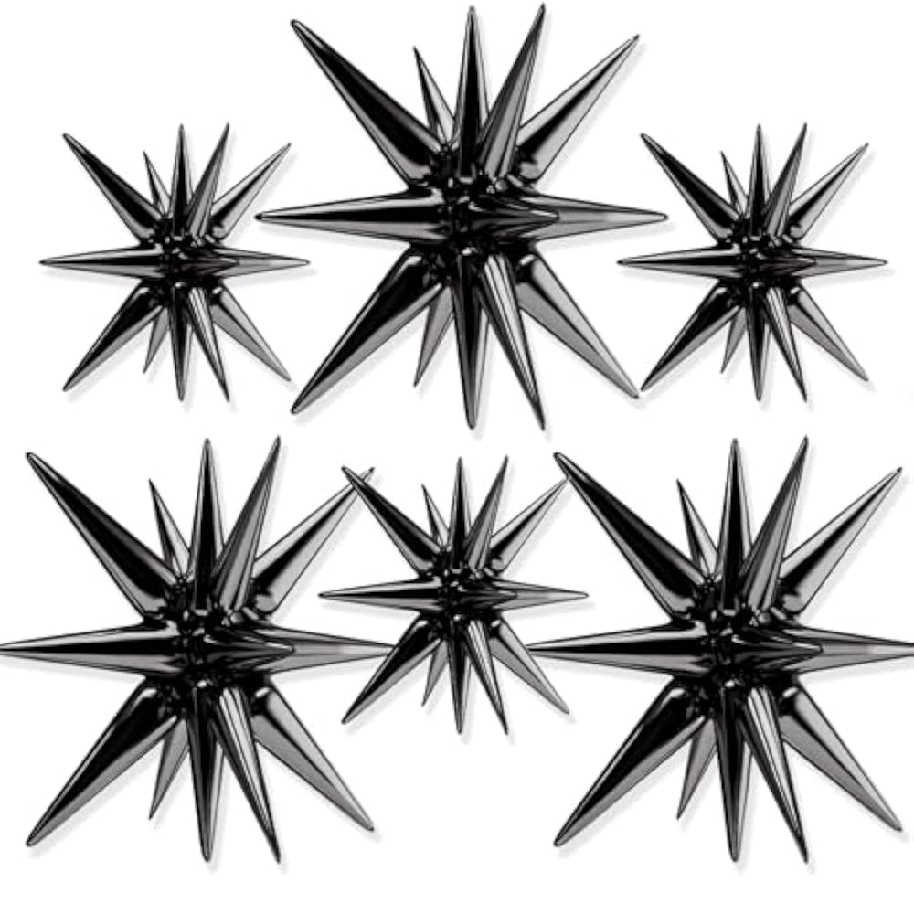 This set features black 14-pointed star explosion balloons in 27-inch and 22-inch sizes, made from durable nylon aluminum foil that stays inflated and is reusable. Easy to inflate with the included straw and curling ribbon, the balloons require no assembly and can be filled with air or helium. Their vibrant black color makes them ideal for birthdays, weddings, and other celebrations, adding a stylish and eye-catching decorative accent.