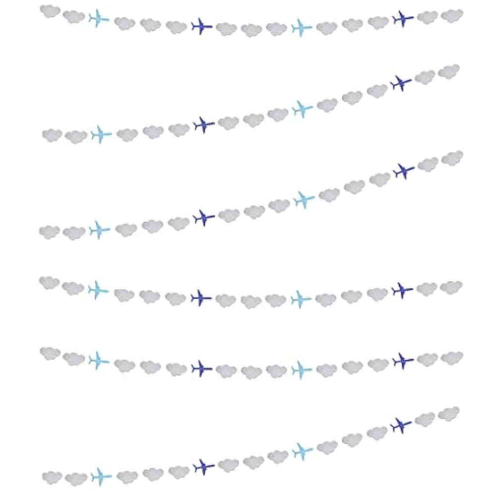 This set includes 6 pre-assembled glitter airplane and cloud garlands made from durable paper cardboard. Each 7.8-foot strand features 13 glittery clouds (3"x2") and 4 airplanes (3.5"x4.8"), sewn directly onto the string for easy hanging. With extra thread on each end, these garlands are ready to hang on walls, ceilings, doors, tables, or windows. Perfect for airplane-themed birthdays, baby showers, weddings, classroom decor, or as a festive photo backdrop for any celebration.