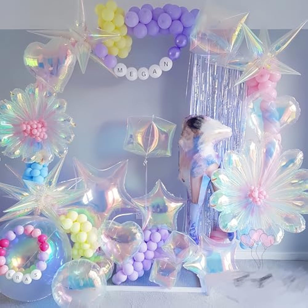 | Set Size:3 Iridescent Love Balloons (18 Inches) + 3 Star Balloons (18 Inches)+ 1 Inflatable Straw + 1 Rollof 10-Meter Ribbon. Balloons Smaller Than Size 22 Cannot Befloated With Helium. | | Fantasy Color Changing:With The Subtle Changes Of Thesunlight, This Set Of Transparent Colorful Balloons Display Multiplecolors Like Magic, Injecting Mystery And Fantasy Into Your Party Scene. No Need For Fireworks, Let The Sun Be The Magician Of Your Party, Creating A Dreamy Paradise With Colorful Lights And Shadows For You! Make Every Moment Picturesque. | | Easy To Install:This Set Of Balloons Is Very Easy To Decorateand Can Be Easily Hung From The Ceiling Or Combined With Other Decorations. Simple Operation And Excellent Results Allow You Toeasily Create The Party Scene Of Your Dreams. | | Applicable Scenarios:This Balloon Is Suitable For Various Occasions Such As Birthday Parties, Weddings, Engagement Ceremonies, Baby Shower Parties, Etc. Whether It Is Indoors Oroutdoors, It Can Show Its Gorgeous Effects. Lt Is A Magic Prop That Creates A Dreamy Atmosphere. Lts Unique Shape And Gorgeous Colors Inject A Fairy-Tale Beauty Into The Scene. | |