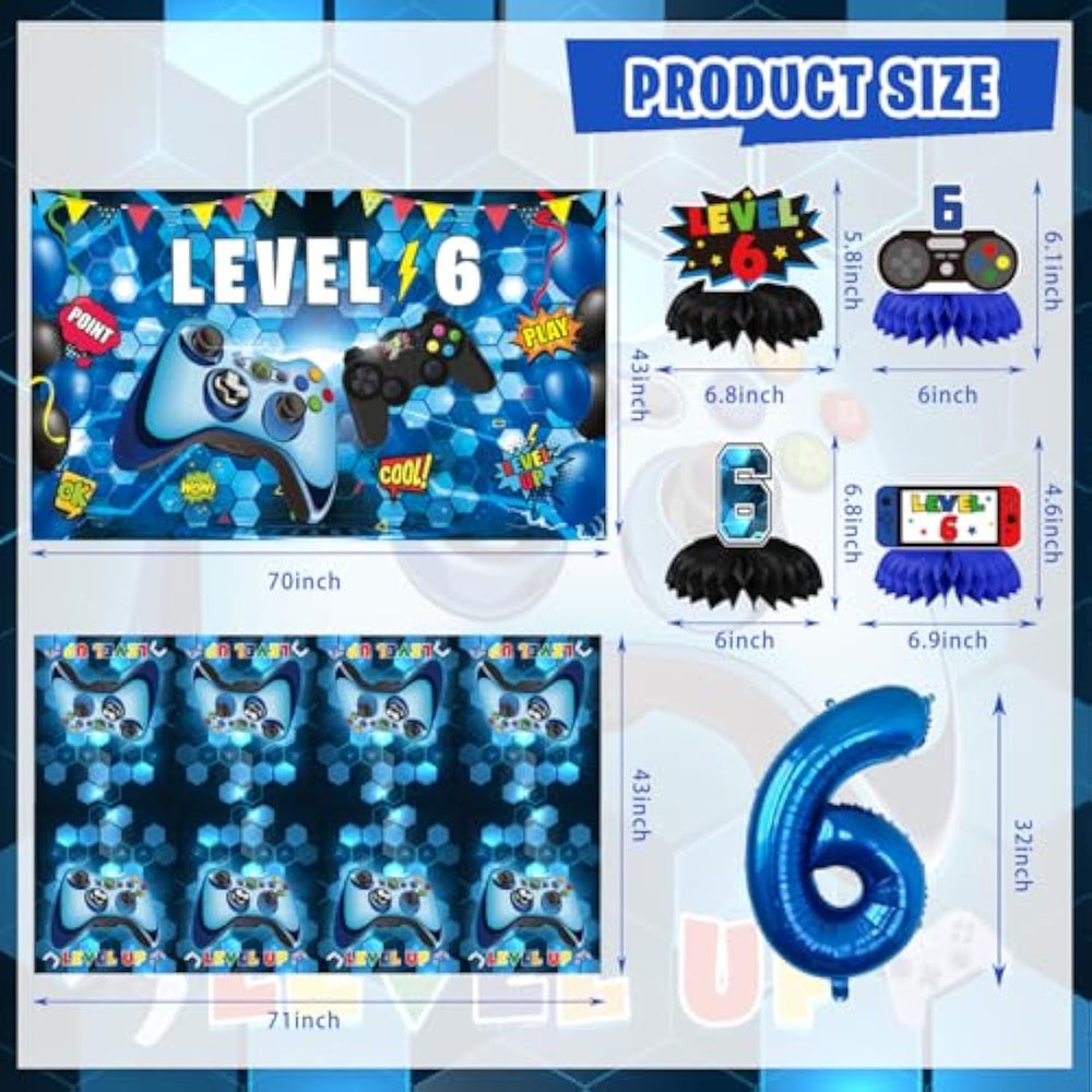 | 6Th Gamer Party Decor - The Novel 6Th Video Game Birthday Party Decorations Will Surely Bring Surprises To The Attendees. The Super Fun Party Centerpieces Will Add Joy To Your 6Th Birthday Celebration. It Will Be An Unforgettable Party. | | What You Will Get - Our 6Th Game Birthday Decorations Set Includes 1 Backdrop, 24 Cupcake Topper, 95 Pcs Latex Balloons (10 Styles), 1 Foil Balloon, 1 Happy Birthday Banner, 1 Level 6 Birthday Cake Topper, 10 Wall Signs, 6 Hanging Swirls, 4 6Th Gamer Centerpiecess, 2 Tablecloth, 1 6Th Hat. | | Steals Social Spotlight - These 6Th Birthday Decorations Will Serve As Fun Photo Props, Creating Memorable Birthday Snapshots For Your Child, Which Of Course Should Be Shared On Your Social Media Updates. Capture And Showcase Your Life To The Fullest! | | Enjoy Assembling - You Might Need Some Time To Put Together The Blue And Black Balloons, Backdrop, And Banners. Hang The Wall Signs And Decorations Wherever You'D Like, As It'S Definitely A Fulfilling And Meaningful Activity That Will Add An Atmosphere To Your 6Th Birthday Party. | | Satisfactory - These 6Th Video Game Birthday Party Supplies Are Made Of Non-Toxic Material.