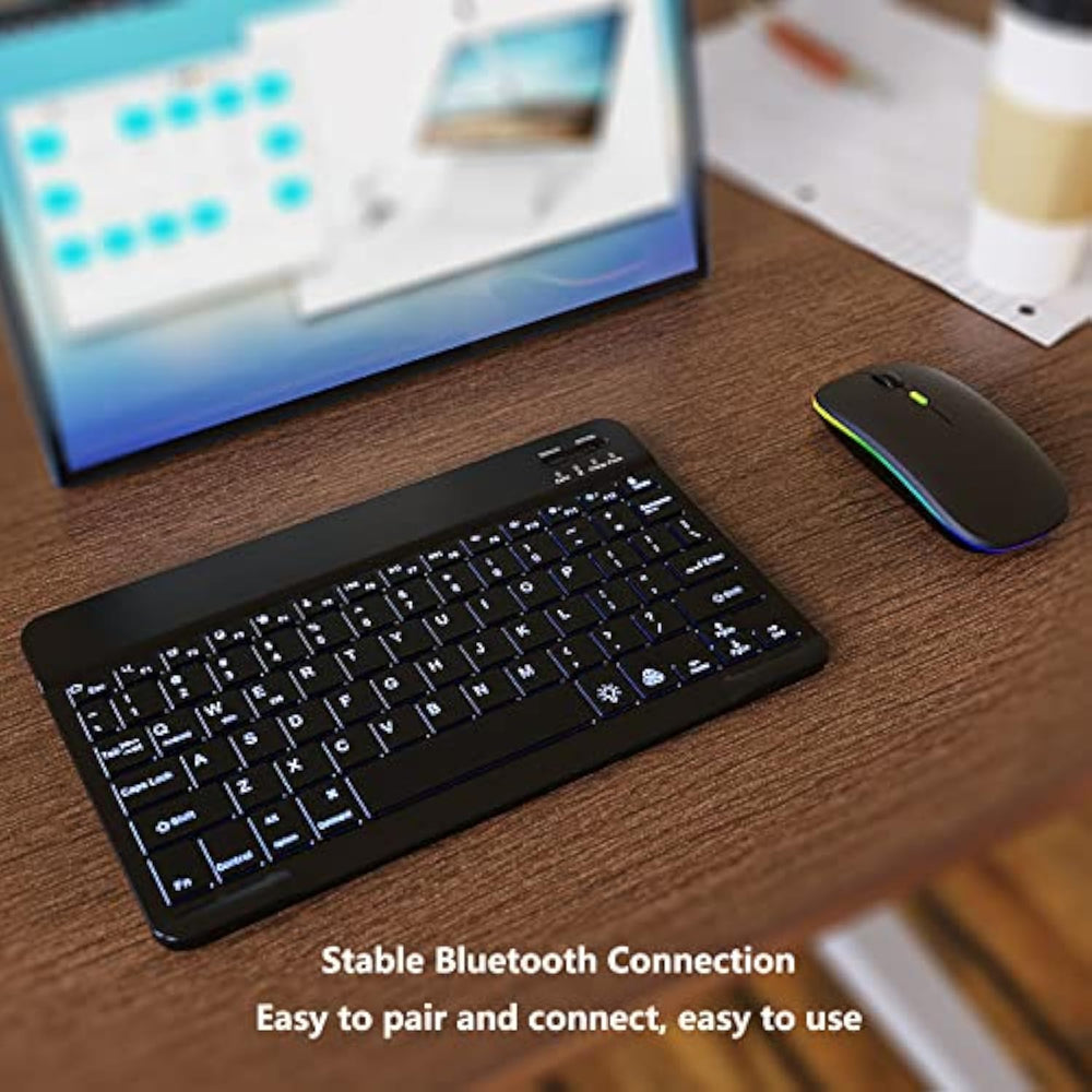 | Colorful Backlight Keyboard: The Keyboard Comes With 7-Colors Led Backlight Mode, A Breathing Light Backlight Mode And 3 Brightness Levels, Which Can Change A Variety Of Different Colors, And Help You To Type Easily In The Darkness, Adding More Fun To Boring Work And Life. The Soft And Bright Lighting Creates A Cool And Exquisite Atmosphere For Work Play. The Back Of The Keyboard Is Made Of Aluminum Alloy And Can Be Used With Your Magnetic Ipad Or Tablet Case | | Stable Bluetooth Connection: The Bluetooth Keyboard And Mouse Set Are Easy To Pair And Connect, Easy To Use. Advanced Bluetooth Technology Provides A Powerful And Reliable Connection With Virtually No Delays Or Dropouts. The Keyboard With Scissor Switch Structure Makes Your Typing Comfortable And Quiet. It Features Multimedia Hotkeys Like Play/ Pause, Volume, Backward Forward, Helping You To Increase Your Workflow And Productivity. Ultra Thin And Portable Design, Easy To Carry | | Led Silent Optical Mouse: Good Surface Coating Provides You With A Comfortable And Skin-Friendly Feel. The Mute Click Reduces Noise By 90%, Making It An Ideal Quiet Mouse For Office, Home, Conference Room, Library, So You Can Focus On Work, Study Without Disturbing Others. 3 Adjustable Dpi (800/ 1200/ 1600 Dpi), Freely To Satisfy Daily Work. High-Definition Optical Tracking Enables Responsive Cursor Control For Precise Smooth Tracking. The Backlight Mode Of The Mouse Cannot Be Changed | | Rechargeable Battery: Built-In Rechargeable Battery, Easily Charged With The Included Charging Cable, Say Goodbye To Repeated Battery Replacement. Automatic Sleep Mode Helps To Extend Battery Life And Save Energy. You Can Click Any Key To Wake Them Up. You Can Turn Off The Keyboard And Mouse Power When Not In Use For A Long Time | | Broad Compatibility: Works With Ipad A16 11Th 10Th 9Th 8Th 7Th Generation, Ipad Pro M4 13 11 12.9 Inch, Ipad Air M3/ M2/ 5Th/ 4Th/ 3Rd Gen, Ipad Mini 7/ 6/ 5, Iphone 16 15 14 13 Pro Max Plus, Samsung Tablet Cell Phone Smartphone And Other Mobile Devices, And Ios, Ipad Os, Android System. Note: Before Connecting The Iphone Or Ipad To The Bluetooth Mouse, Please Up Your System To Ios 13/ Ipad Os 13 Or Above, And Enable The Assistive Touch: Setting - Accessibility - Assistive Touch | |