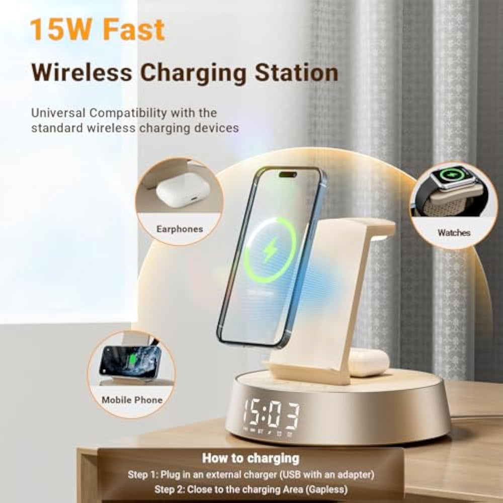 | 2024??Your All-In-One Solution: You Can Enjoy A Dual Alarm Clock With Snooze Modes, Bluetooth Speaker, Fm Radio, 3-Speed Adjustable Night Lights, Phone/ Watch/ Earphones Wireless Charger (No Need For Cable). Alarm Clock With Wireless Charging Allows You To Conveniently Charge The Smartphone, Smartwatch, And Wireless Earbuds, Designed For Both Apple And Android Users. Say Goodbye To Messy Wires And Save Space For Your Nightstand, Beside Table, Or Bedroom. It Is Both Functional And Adorable | | Bedside Alarm Clock: Customize Night Light Brightness From 0-30%-70%-100%, Experience A Soothing Ambiance With Our Night Light, Enjoy Soft, Flicker-Free Illumination That Protects Your Eyes. The Digital Alarm Clock Screen Has Clear Visibility, With A Smart Chip And Built-In Battery For Memory Function. Features Dual Alarms, Snooze Mode, And Flexible Time Modes [12 Or 24 Hr Am Or Pm] For You To Choose From. Snooze Allows An Extra 5 Minutes Of Slumber, Each Alarm Is Limited To Three Snoozes | | Widely Compatible: Support Majority Apple And Android Phones With Wireless Charging, Compatible With Iphone 8-16 Series, (Any Series After The Iphone 8 Can Be Charged In The Wireless Charging Zone, Including The Iphone 8 Series), Samsung Galaxy S24/S23/S22 Ultra/C55/M55/A55/A35, Google Pixel 8 Pro/7/6A Etc Devices, Apple Watch 9/8/7/6/5/4/3/2/Se/Ultra | | Charging Safe Protection Phone Case Friendly: Alarm Clock With Wireless Charger Is Crafted From Special Abs Material, Ensuring Low Energy Consumption And Efficient Heat Dissipation For Durability And Top Performance. The Heat Dissipation Holes On The Back Of The Charging Station, Protect Your Devices From Overcharge Damage And Ensure Safe Charging. Plus, It'S Compatible With Phone Cases ? 3Mm (Non-Metal Case). Comes With A Manual For Easy Setup | | What You Get: You Will Get The Wireless Charging Station 6 In 1 +18W Adapter + 3.3Ft Type-C Cable + User Manual + Complete Box, Such A Great Gift Idea! Plus, Count On Exceptional