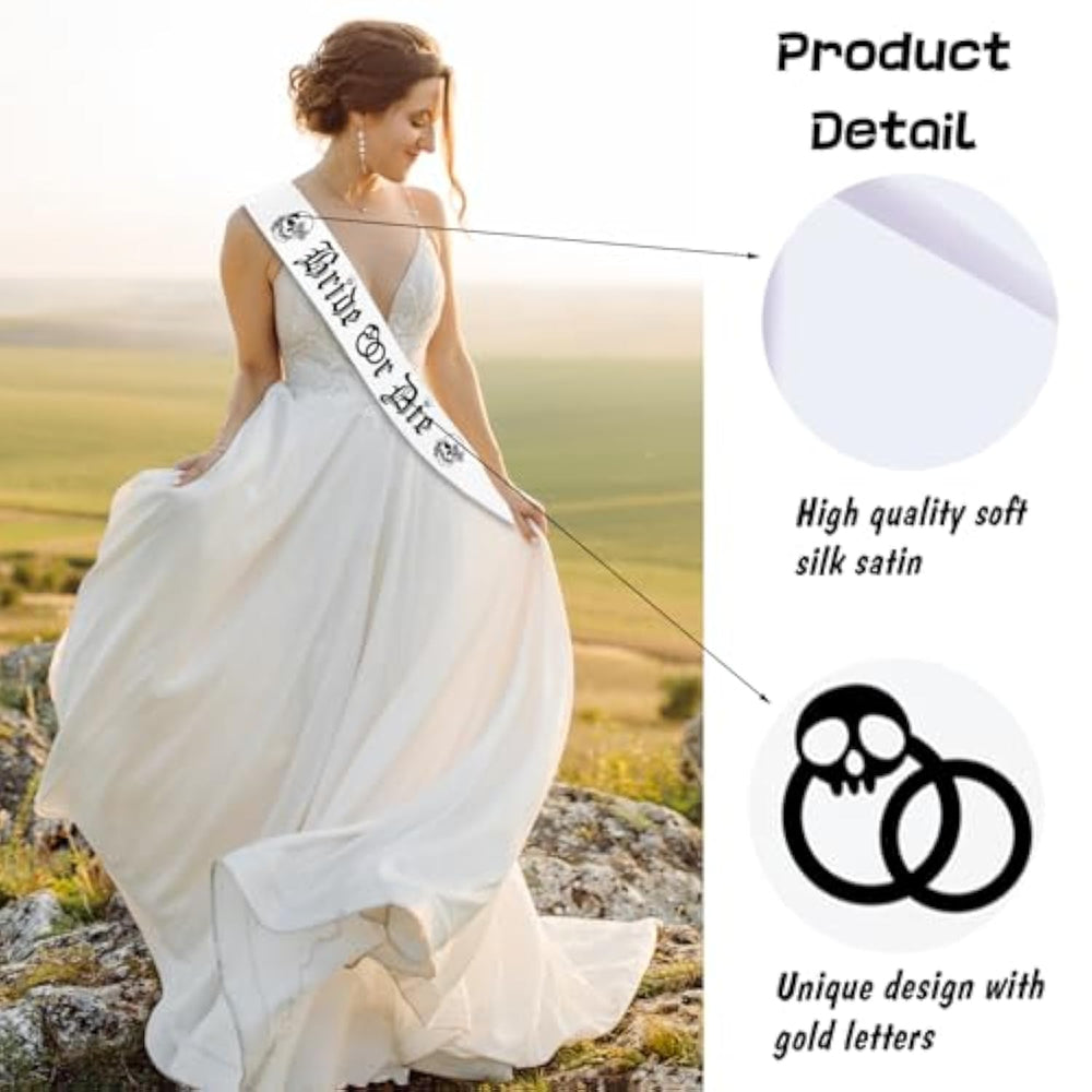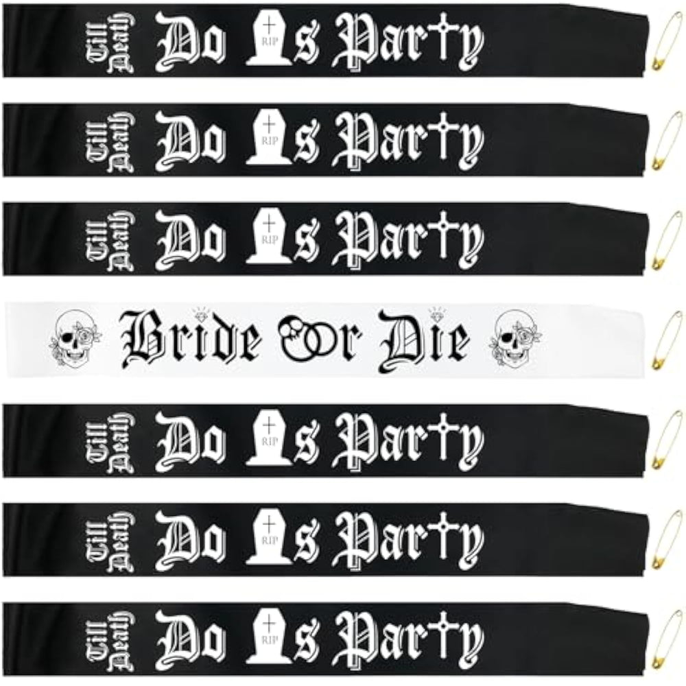 | Hand Wash Only | | Bride Sash Bachelorette Party: Package Including 1 Pcs White "Bride Or Die" Sash With Black Printed Letters, 6 Pcs Black "Till Death Do Us Party" Team Bride Sashes Perfect For Your Bachelorette Party Or Engagement Party, This Is A Must Have For Bride Shower Hen Party. Enjoy A Memorable Bachelorette Party With Your Friends | | Till Death Do Us Party Bachelorette Decorations: Our Bridal Shower Sashes Are Printed With The Distinctive Text, Featuring Skull Pattern, And The Letters Are Printed With Gothic Font, Delicate In Appearance, Ideal Decoration For Bachelor Parties | | Premium Quality:The Cool Bridal Sash Made Of Premium Quality Satin Sash With Glitter Lettering. Unlike Other Poorly Made Sashes, This Sash Does Not Tear Or Wrinkle Easily. No Need To Worry About Letters Peeling Off | | Suitable Size: The Bride To Be Sash Is 31.5 Inches Length And 3.74 Inches Width. A Safety Pin Is Included Inside, Which Can Be Used To Fix The Sash, Our Sash Is Suitable For Most People, You Can Use It With Confidence | | After-Sales Service: Please Note That If The Sash Arrives Slightly Wrinkled From Transit - It'S Best To Iron On The Back Of The Sash To Prevent The Foil From Melting! Wish You Or Your Family And Friends Have A Nice Party | |