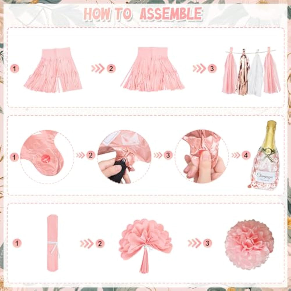 This elegant bridal shower decoration set features a charming rose gold color scheme, perfect for creating a romantic and inviting atmosphere for your celebration. The set includes 6pcs 12-inch confetti balloons, 35pcs 10-inch balloons (15 pink, 15 rose gold, 10 white), 6pcs paper pom poms, 3pcs foil balloons, 12pcs photo props, 1 glitter sash, 1 bridal veil, 1 backdrop, and 15pcs paper tassels. The premium quality materials used for the decorations, such as lightweight tassels, pompoms, and paper elements, ensure a worry-free and beautiful setup for any bridal shower, bachelorette party, or celebration. With its elegant design, this set will create a memorable and stylish atmosphere for the bride-to-be and her guests.
