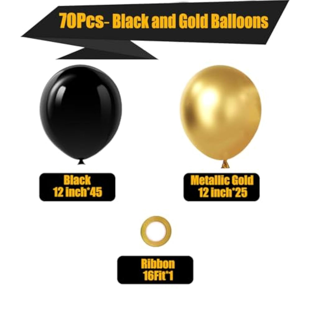 This 70-piece Black and Gold Balloon Set includes 25 metallic gold and 45 black 12-inch latex balloons, along with a roll of gold ribbon. Made from eco-friendly, biodegradable latex, these balloons are thick, durable, and have a smooth, shiny finish. Perfect for birthdays, graduations, anniversaries, baby showers, Father’s Day, and New Year celebrations, they can be filled with air or helium. For best results, inflate balloons to about 90% and store them in a cool place to preserve their color and shine.
