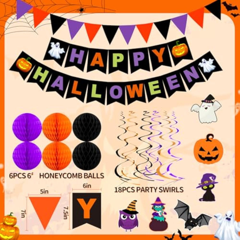 This Halloween decoration set includes a “Happy Halloween” banner, six honeycomb balls, 24 PVC bat stickers, 18 swirl streamers, 20 latex balloons, and a triangle bunting flag, giving you everything you need for a complete party setup. Designed in classic Halloween colors of purple, orange, and black, it features festive elements like pumpkins, witches, bats, cats, owls, and ghosts to create a spooky yet fun atmosphere. Made from eco-friendly, reusable materials including paper and PVC, the decorations are durable and safe to use. Easy to assemble with included adhesive and pre-designed folds, the set allows quick decorating for ceilings, windows, mantels, trees, or walls, making your party setup fast and hassle-free.